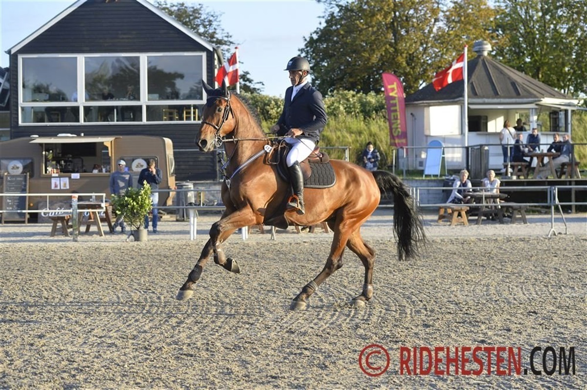 – Det er faktisk første stævne, vi rider, i tre måneder, fordi vi har holdt en lidt lang stævnepause. Så han var lidt rusten den første dag, men han kom hurtigt efter det og blev 7'er i går og så 3'er i dag. Han sprang helt fantastisk i dag, og vi rider os ind på en tredjeplads efter første runde og holder så den placering efter anden runde. Han er kun 8 år gammel og også en virkelig stor hest, så at han kan gå ind og gøre det, er jeg supergodt tilfreds med, fortæller Lars, der købte Dinapo som føl på auktion i Hammelev og tilmed tidligere har redet vallakkens storesøster.