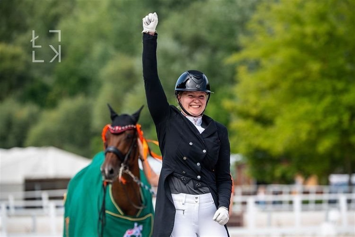 – I 2021, da jeg var 19 år, red vi et lille stævne her i Holland på Intermediaire II-niveau, og der fik vi med det samme 71%. Så jeg kontaktede Anne-Mette Binder for at høre, om jeg måtte starte internationalt det år, og så red vi vores første, internationale stævne, hvor vi fik 67%, så det var okay. Vi var til NM det år også, og der fik vi holdguld og individuelt sølv med hjem, og i år er Dio bare blevet mere og mere fantastisk, runder en glad og stolt Thea Bech af.