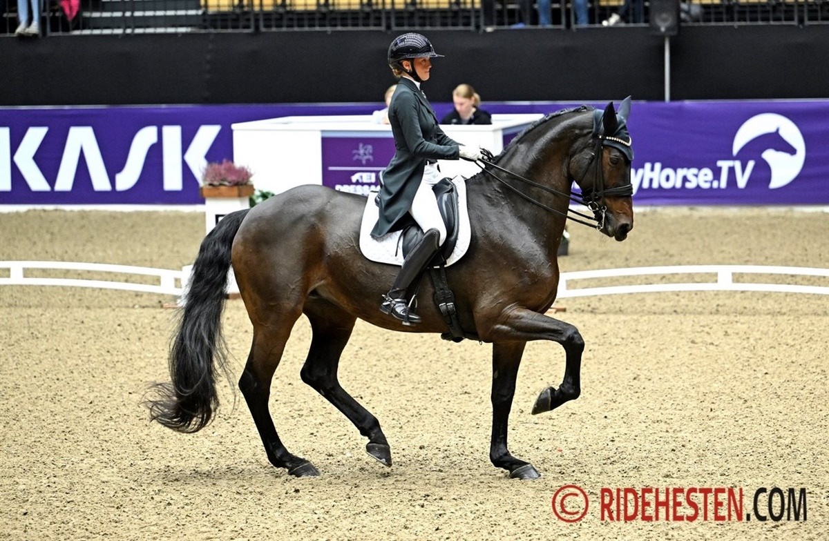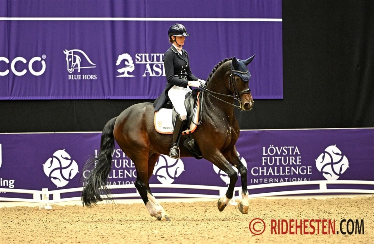 Blot 19-årige Sophia Boje Obel Jørgensen har deltaget i turneringen med familiens hjemmeavlede, 12-årige DV-hoppe Foldagers Chablis e. Blue Hors Romanov/ Idocus (opdr. Mette Frederiksen) og har leveret to stabile præstationer. Hun sluttede i dag på femtepladsen med 72,700% lige efter landsmand Cecilie Dybro Jensen, der med den 9-årige vallak Zagori e. Blue Hors Zack/ Sir Donnerhall II OLD, som hun selv har uddannet, opnåede 73,045% og blev klassens nr. 4.