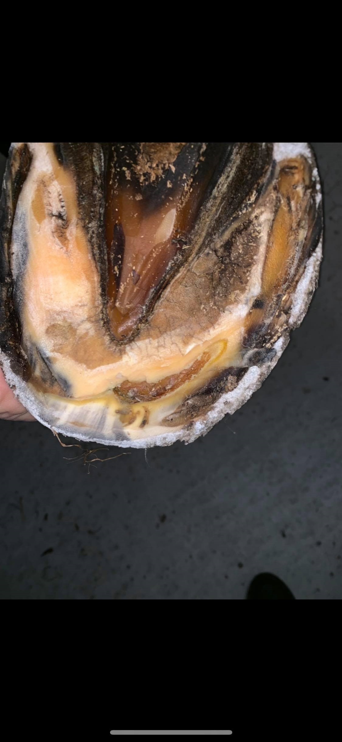 Billede af hov efter smed har skrået ud: Billedtekst: Sådan så hoven ud, da smeden havde skåret halvdelen af hovbylden helt fri. Og hvis I husker røntgenbilledet, så var den lige så stor på den anden side.
