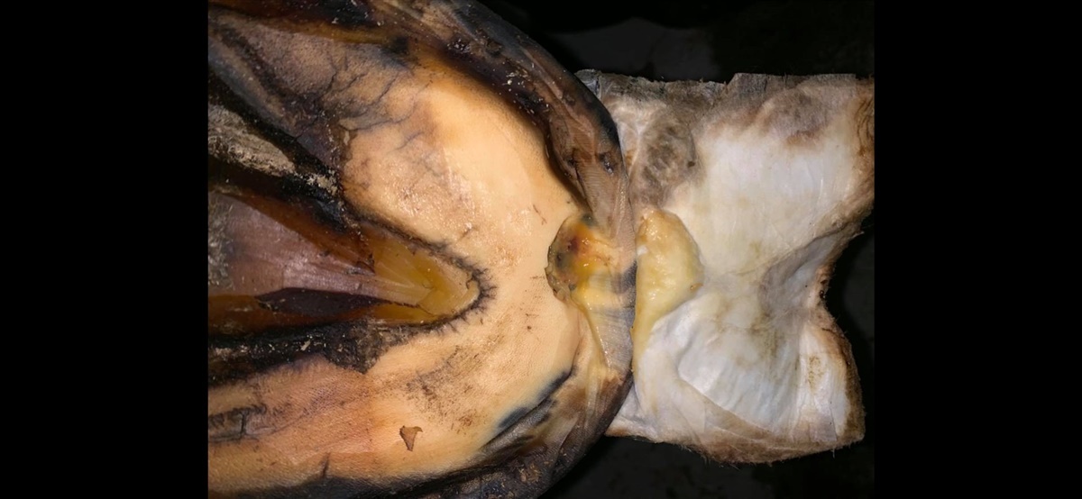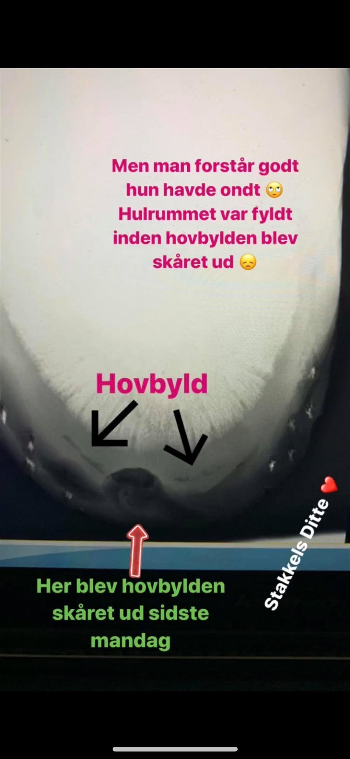 Da smeden ville være helt sikker på, at alt var som det skulle være, ville han have nogle nye billeder fra nogle andre vinkler. Han kunne nemlig se, at hovbylden gik i to grene på hver side af det hul, han havde lavet. Så selvfølgelig kom dyrlægen ud igen. Der blev taget nye billeder, og herunder kan I se hvordan det så ud efter smeden havde skåret bylden fri – når man ser det billede, så forstår man godt at hun havde ondt i næsten hele hoven!