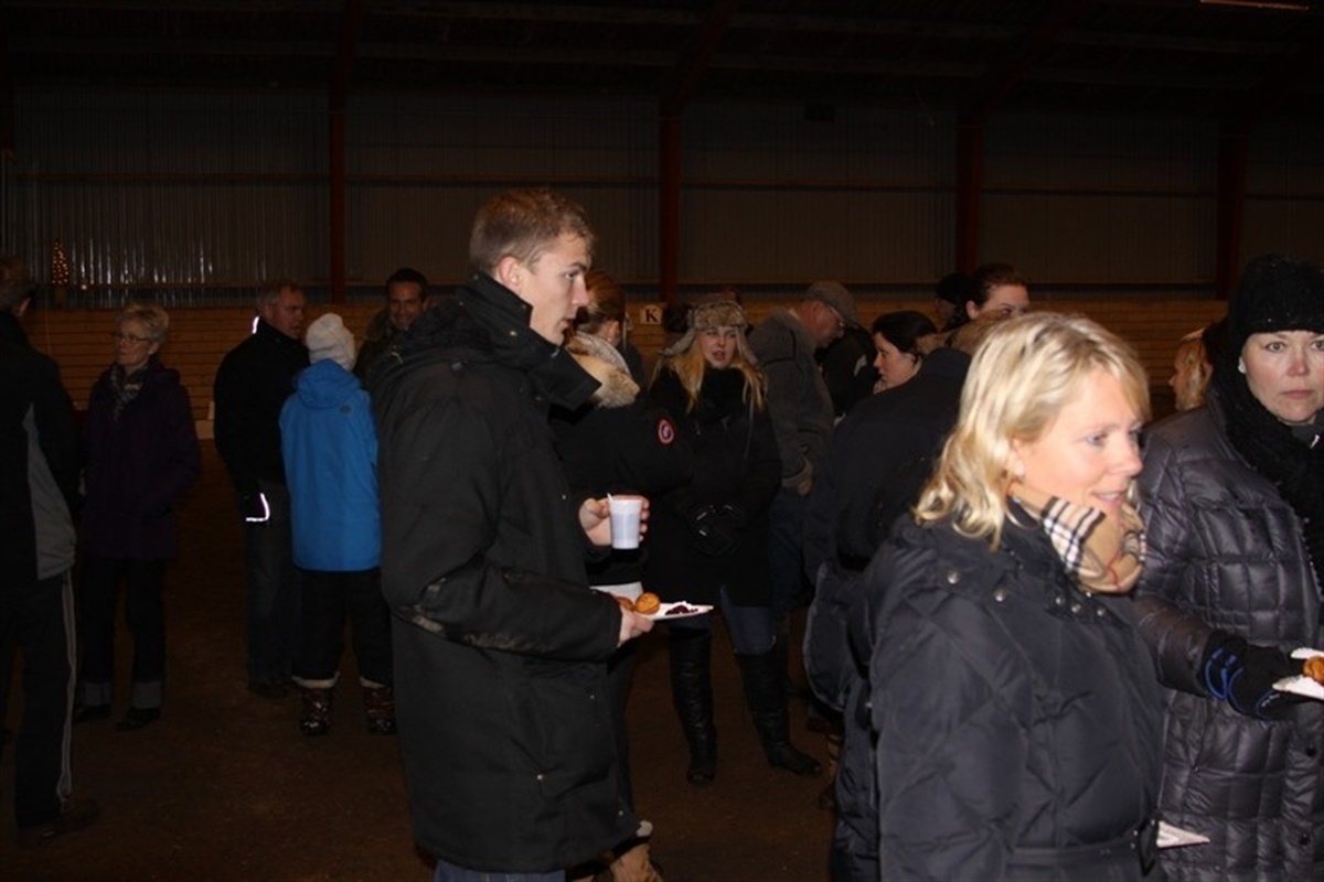 Hvis man ikke var i julestemning, så kom man det straks! Gården var pyntet i bedste julestil, der blev solgt æbleskiver og gløgg, og små nissepiger og nissemænd delte julesang og småkager ud til de besøgende gæster. Første indslag ved arrangementet, var pas de deux med juniorrytteren Cathrine Dufour på dette års EM-sølvvinder Atterupgaards Cassidy, og ungrytteren Carina Nevermann Torup på den danske trakehnerhingst, Kafelnikov. Pas de deuxen bestod i et sammensat program på Prix St. George niveau med tilhørende musik, sammensat af raro music. Cathrine og Carina har før redet opvisninger sammen, og det var tydeligt at se, at de nød at ride sammen; de to skønne heste dansede afsted til den flotte musik og da de to ekvipager til sidst red samlet ad midten, fik de en bragende klapsalve af de mellem 150 og 200 mennesker, der var mødt op. Carina og Cathrine om opvisningen: "Vi har haft det rigtig sjovt med at træne pas de deuxen, og vi nød i høj grad at ride på banen til den flotte musik. Det er altid lidt sjovere at ride sammen på banen, da det giver lidt mere stemning". "Udover at det var hyggeligt at ride sammen, var det rigtig, rigtig flot at Langebækgaard havde formået at samle så mange mennesker - der var jo nærmest flere tilskuere end til et DM", slutter de to piger med et smil. Efter pas de deuxen fremviste Langebækgaards eget pigekor et smukt lucia optog til hest. Lyset var slukket, og samtlige ekvipager var klædt helt i hvidt,og udsmykket med lyskæder på ridehjelmen; smukt for både øje og øre :) Tippet nyhed.