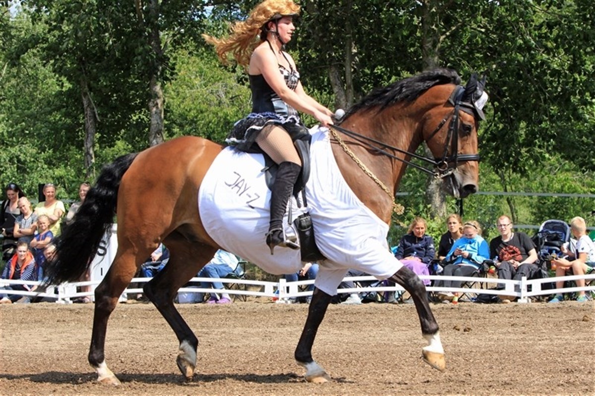 Frieser hingsten Adonis (e. Fabe 348/Tetse 394) og hans rytter Sara Rank gjorde det super som cheerleader Black Thunder. Her måtte hovedsponsor og udklædningsdommer, Gitte Märcher, op og danse med Sara og Adonis' dygtige team.