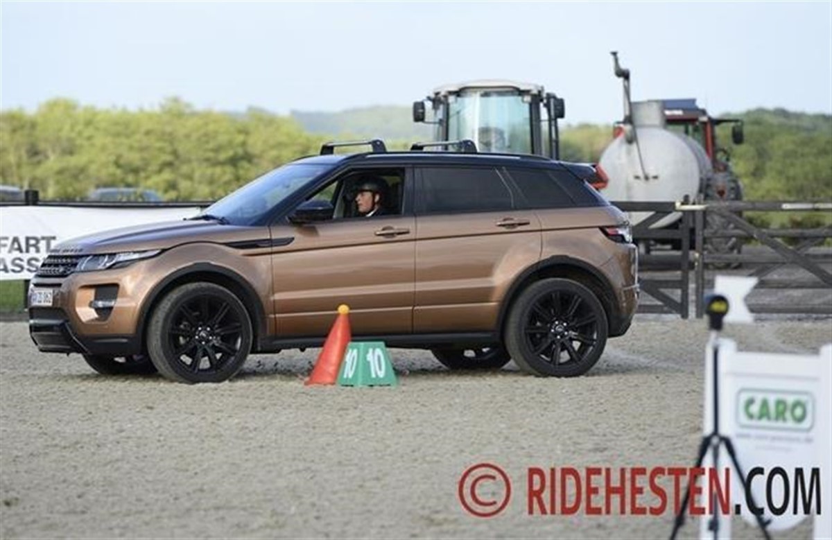 Otte ryttere stillede op til den specielle udfordring: Rid en bane på fem forhindringer så hurtigt, du kan, hop af hesten i en fart, løb hen til at Range Rover Evoque, husk at spænde sikkerhedssele og kør en bane på endnu fem forhindringer – denne gang dog ikke de høje, man springer over, men mellem kegler med en kugle på toppen, man ikke må rive ned. Ryger der en kegle eller en forhindring lægges der fem sekunder til ens tid.
