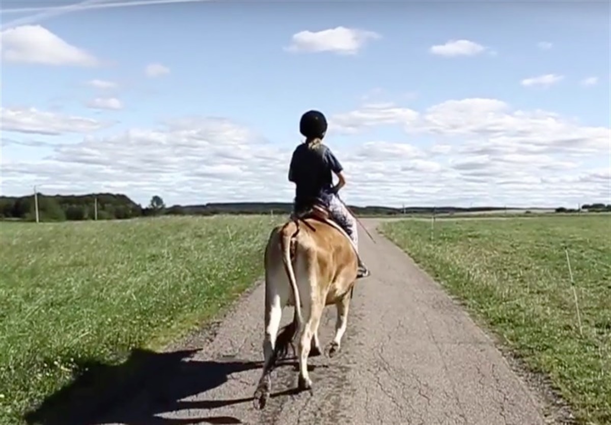 9 årige Wilma bor på en gård hvor der bliver arbejdet med mælkeproduktion. Hun har fået et helt specielt forhold til Jerseykoen Snäckan som hun både kører med, og rider på. Snäckan der ikke har meget sadelleje, får holdt sadlen på plads ved hjælp af en halerem. Wilma siger selv at det faktisk er lidt lettere at ride på køer, fordi de ikke bukker så meget. Det ser også meget fredeligt ud på videoen.
