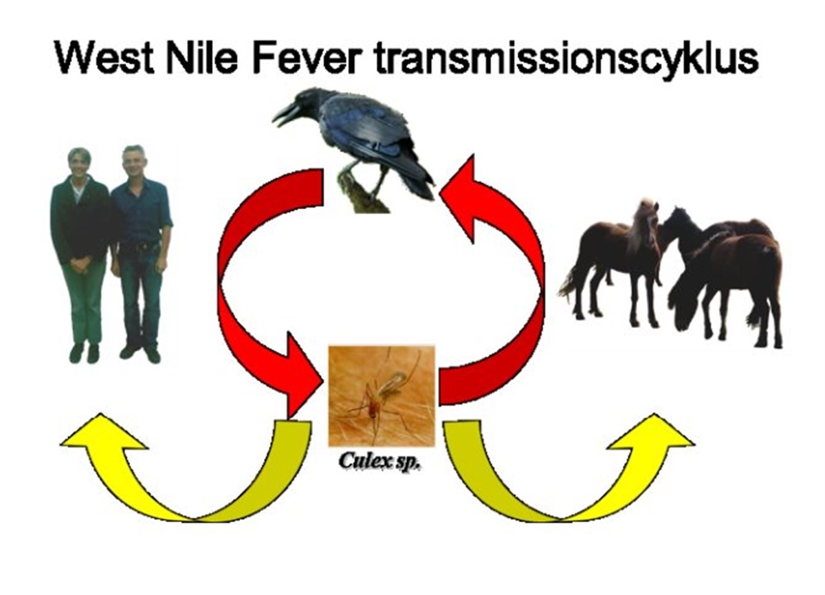 West Nile Fever-virussen er en sygdom af afrikansk oprindelse, der hovedsageligt optræder hos fugle. WNF kan overføres til pattedyr via inficerede blodsugende stikmyg, hvor specielt heste og mennesker er særligt følsomme. Heste og mennesker er dog såkaldte slutværter, der har et lavt indhold af virussen. Det vil derfor sige, at de ikke kan smitte videre. Mellem fugle og heste samt fugle og mennesker kan transmission udelukkende foregå med de arter af stikmyg, som kan optage blodmåltid både på fugle og pattedyr. Disse myggearter findes også i Danmark, men WNF-virus er endnu ikke påvist i Danmark, hverken i myg eller fugle. Inkubationstiden hos heste er 2-15 dage. Hos heste er de fleste tilfælde uden symptomer eller kommer til udtryk ved svage, influenzalignende symptomer. I sjældne tilfælde (dvs. under 10%) udvikles meningo-encephalomyelitis (hjernehindebetændelse og hjernebetændelse) med centralnervøse forstyrrelser, forringet syn, tvangsbevægelser, nedsatte reflekser, rystelser, ujævn gang og omflakken. Dødeligheden hos heste med alvorlige kliniske symptomer er høj. Der findes vacciner mod WNF til heste og gæs. Der findes på nuværende tidspunkt ingen vaccine til mennesker. Der har aldrig været konstateret udbrud af WNF i dyr i Danmark.