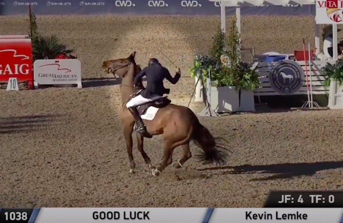 Kevin Lemke har beklaget sin dårlige opførsel overfor sin hest Good Luck, som han ved Desert International Horse Park, California, piskede og tvang igennem en forhindring, den ikke kunne springe. Det hjælper ikke meget med beklagelse og undskyldning og en forsikring om, at det ikke vil gentage sig, for den amerikanske dyreværnsforening PETA (People for the Ethical Treatment of Animals) har sat sagen på deres dagsorden.