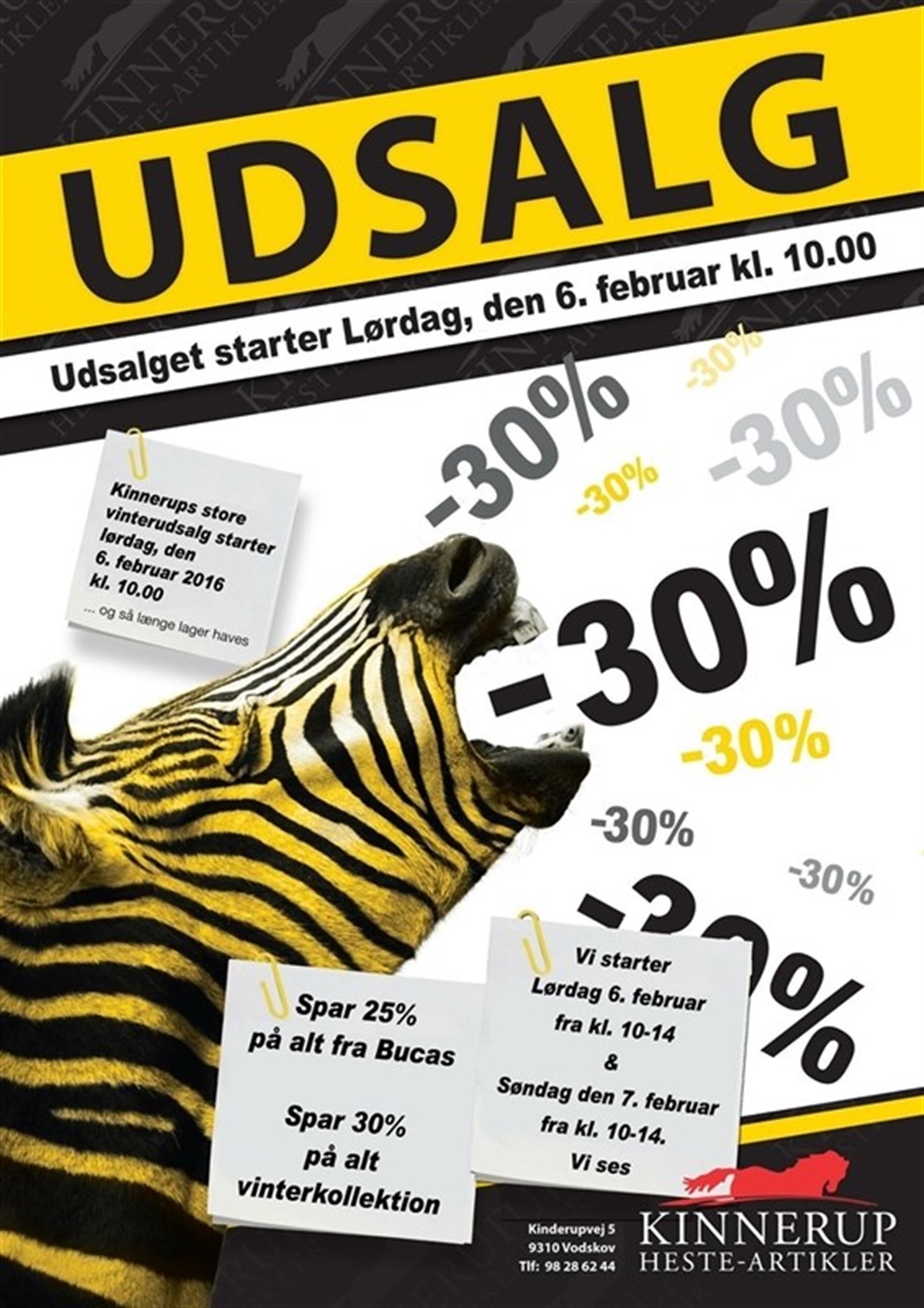 Kinnerup Hesteartiklers vinterudsalg starter i morgen lørdag den 6. februar. Hele weekenden kører de med uimodståelige tilbud som fx -25% rabat på alle varer fra Bucas og -30% på hele vinterkollektionen.