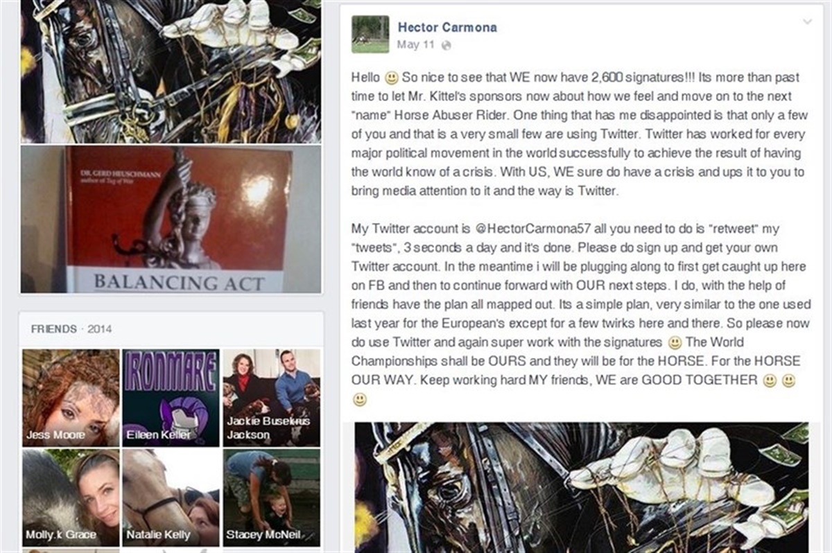 "Hello, So nice to see that WE now have 2.600 signatures!!! It's more than past time to let Mr. Kittel's sponsors now about how we feel and move on to the next "name" Horse Abuser Rider."