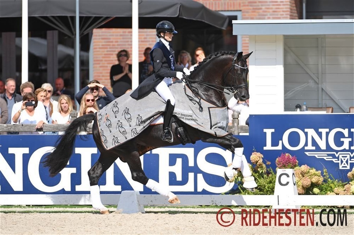 I det øjeblik Kjento betrådte arenaen, var man ikke i tvivl om, at der her var tale om en verdensmester - vel og mærket betinget af et nogenlunde fejlfrit ridt, og det er hans rytter, den nykårede verdensmester Charlotte Fry, mester i at levere. Det dansk-hollandske par, Anne og Gertjan van Olst, er ejerne af den sorte, maskuline hingst e. Negro/ Jazz, og de har stor succes med deres hingste på de internationale konkurrencebaner.