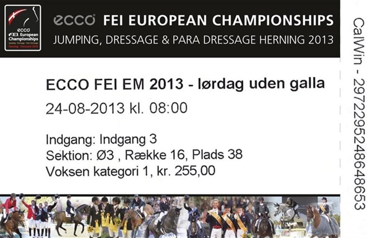 Arrangørerne bag det tredobbelte EM i springning, dressur og paradressur, der afholdes i Herning 20.-25. august 2013, opfordrer til, at man kigger forbi deres stand i Herning 6.-10. marts, da billetterne til det kæmpestore EM-arrangement på dansk grund forventes udsolgt fra midten af marts. Rift om billetterne – Af de i alt 25.000 EM-billetter til fredag, lørdag og søndag har vi allerede solgt de 13.000. Der er rift om billetterne, og vi sælger også mange til udlandet, så vi glæder os til gæster fra både ind- og udland, fortæller Jens Trabjerg, direktør for European-Herning ApS. Jens Trabjerg oplyser, at der kun er få kategori 1 EM-billetter tilbage til lørdag og søndag. – Sidste chance er sandsynligvis på standen i Herning, og her er der i øvrigt 5% rabat på billetterne, idet der er rabat på alle billetter indtil 1. maj, uddyber han. EM og camping – med messerabat ECCO FEI European Championships har sammensat et specielt messetilbud, man kan nyde godt af, hvis man køber denne EM-billettype på standen i Herning 6.-10. marts. – Hvis man samlet køber fire kategori 2 partoutbilletter og campingplads fra tirsdag til søndag koster det kun 1.500 kr. pr. person. Vi kan også tilbyde fire kategori 2 partoutbilletter og leje af en campingvogn til overnatning for fire personer for 2.500 kr. pr. person, oplyser Jens Trabjerg og tilføjer, at man i forbindelse med EM forventer at få besøg af flere tusind campister. ECCO FEI European Championships møder op med billetoversigt og printer under hingstekåringen i Herning, så man kan få sin EM-billet i hånden med det samme. Hold øje med billetterne på stand E 4058, hvor der også vil være konkurrencer med store præmier. Læs mere om europamesterskaberne i springning, dressur og paradressur 2013 via linket til højre.