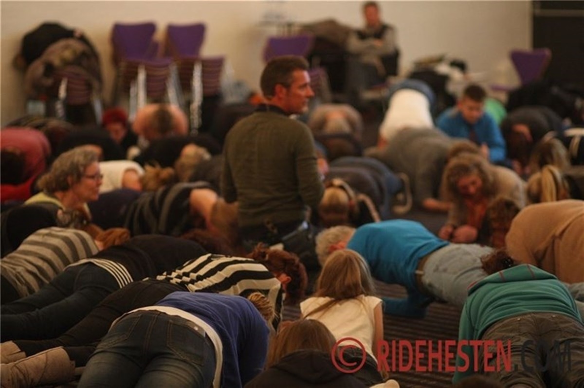 Efter en kort indledning blev stolene sat til side og de forskellige øvelser blev afprøvet. De skal blandt andet bruges til rytterens opvarmning inden man sidder op på hesten. For at forstå hesten bedre, skulle hele forsamlingen ned på alle fire og 'lege hest'. Det gjaldt bla. Om at tage hovedet langt ind, for at efterligne den omtalte træningsmetode roll-kur. Ved denne øvelse lagde man mærke til den indskrænkede vejrtrækning og det ubehagelige træk i nakken.