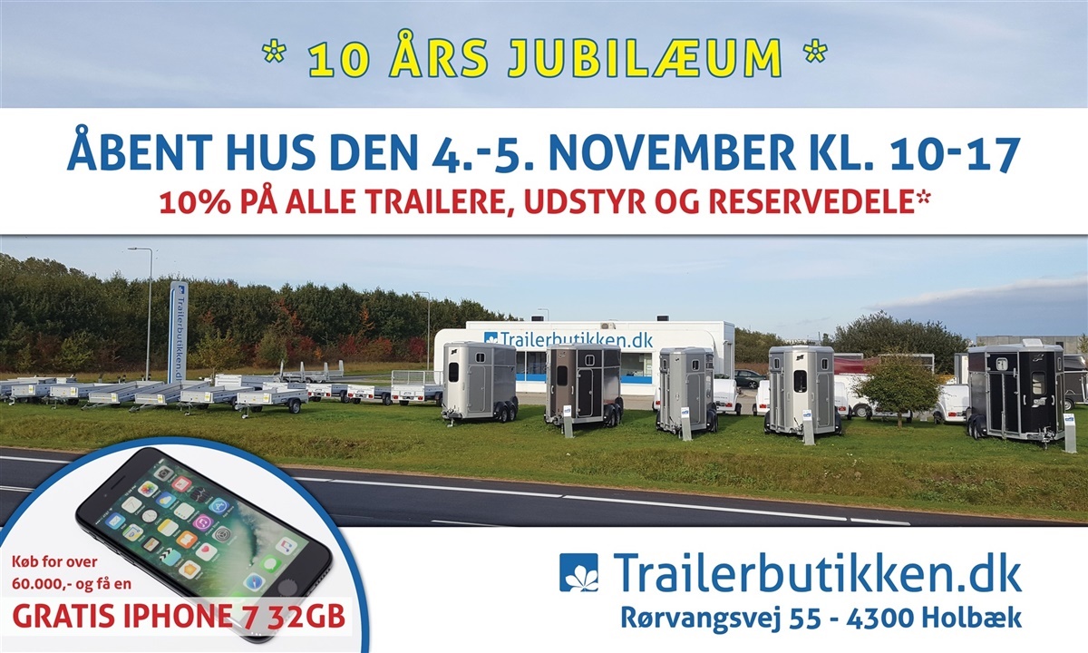 Samtidig vil der være 10% rabat på alle lagerførte trailere, udstyr og reservedele begge dage og køber du for mere end 60.000 inkl. moms, får du en iPhone 7 32GB gratis med i købet!