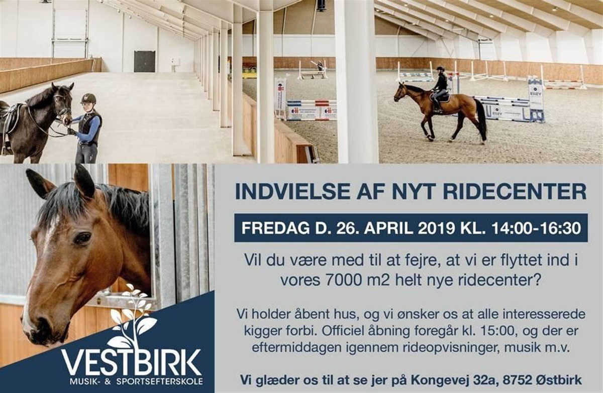Vil du være med til at fejre at Vestbirk Musik & Sportsefterskoles nye ridecenter er færdig. Det 7000 kvadratmeter store ridecenter står nu klart og det fejres med åbent hus, hvor alle interesserede er velkomne.