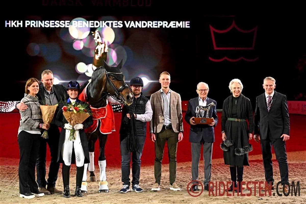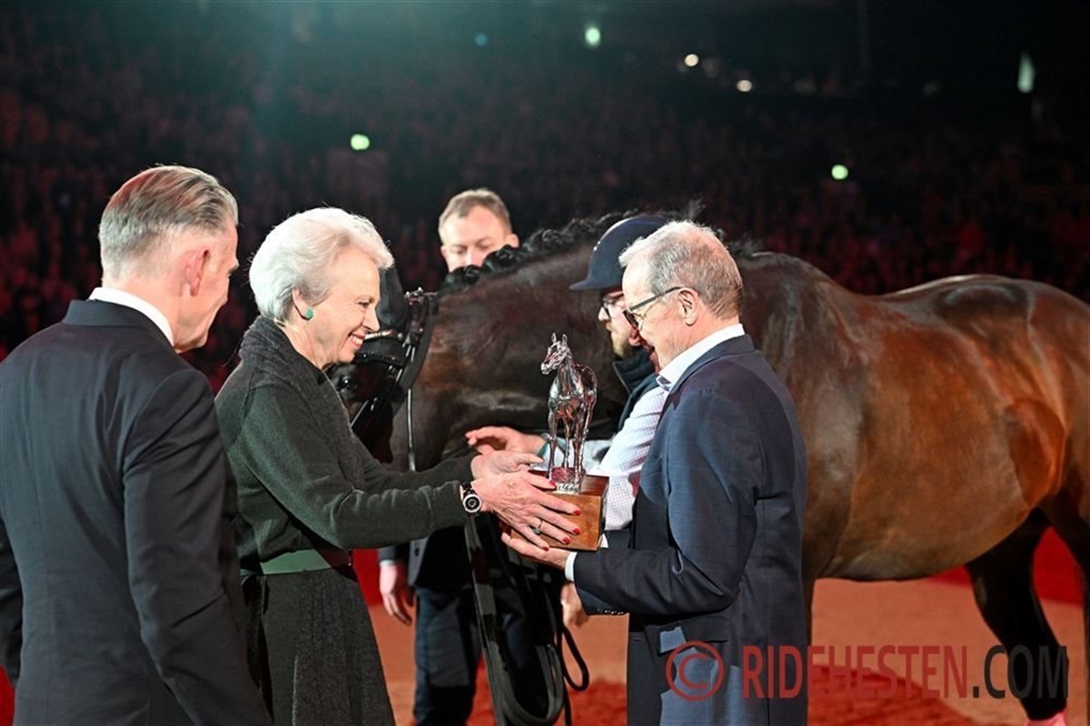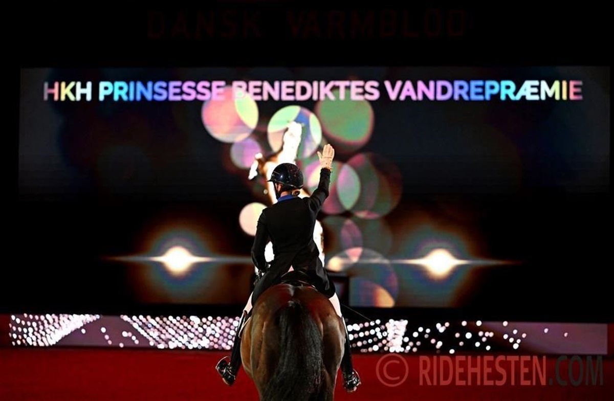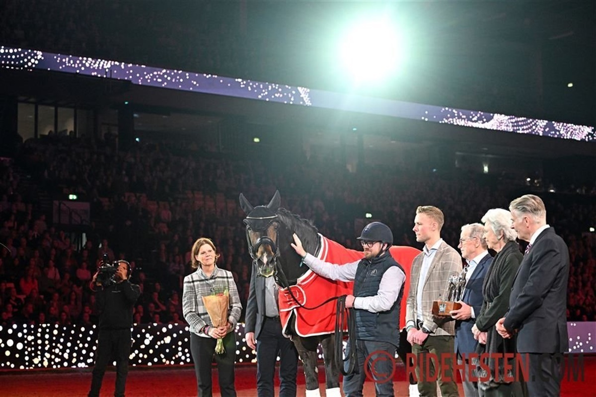 Da sadlen kom af hingsten fik han i stedet sit eget, flotte æresdækken på, og så overrakte H.K.H. Prinsesse Benedikte selv sin pris til Kjeld Kirk Kristiansen – mens Martin trak Blue Hors Zack ud af hallen til stående applaus.