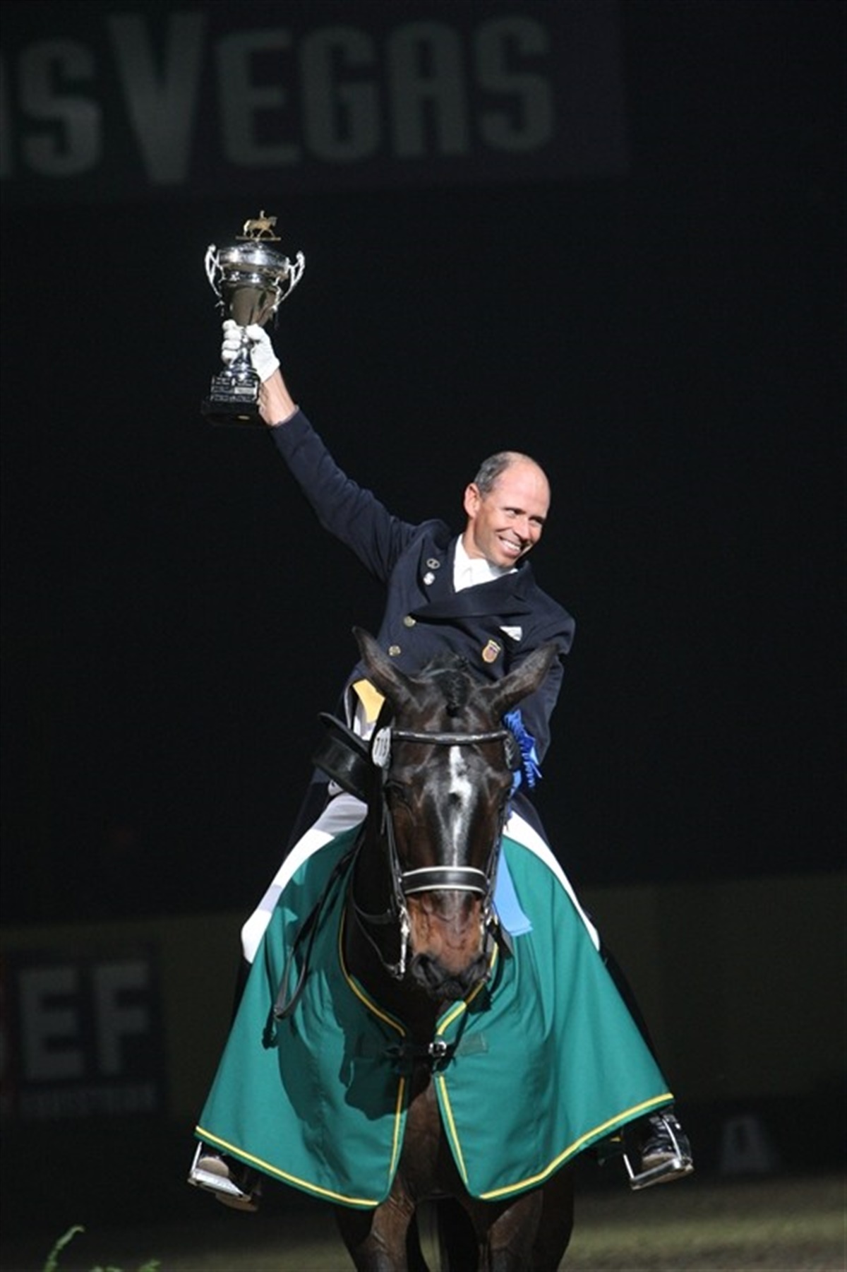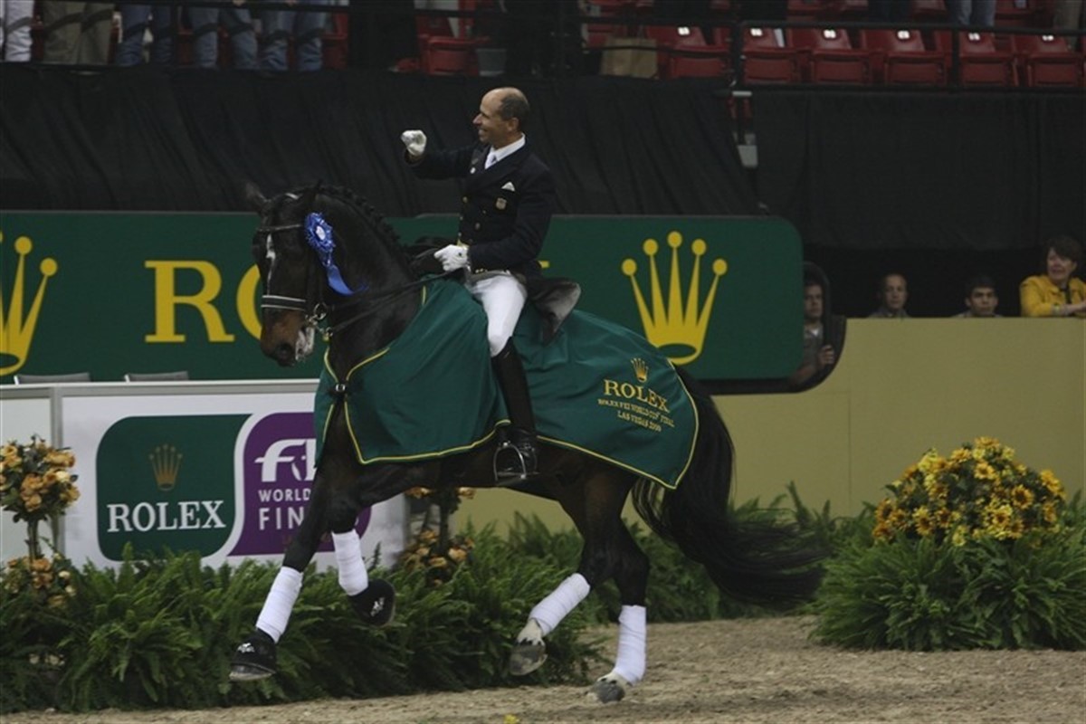 Stor sværhedsgrad, flotte piaffer og passage, en interessant sammensætning af øvelserne og et stort set fejlfrit kürprogram, det var Steffen Peters' opskrift, og den sikrede ham succes - han slog de to verdensstjerner Isabell Werth/Satchmo og Anky van Grunsven/IPS Painted Black væk fra tronen - og hjemmepublikummet elskede hvert et minut af det. Med 84,95% gik han i spidsen af konkurrencen, og han er da også amerikanske Linda Zang og hollandske Wim Erens tak skyldig, for de to dommere gav ham hele 93% for kunstnerisk indtryk! - Det var virkelig magisk grund derinde i aften, og jeg er så glad, og at få lov til at dele dette øjeblik med det fantastiske dressurpublikum, det er en fantastisk følelse, sagde Steffen mens hans stemme knækkede over. Isabell Werth red et klassisk smukt kürprogram på Satchmo, men hun fik fejl i toerchangementerne, og så så Satchmo måske ikke helt så veltilpas ud, som vi har set ham. Hun fik 84,5%. Anky van Grunsven red de absolut sidste reserver ud af IPS Painted Black der lyttede til rytteren med hele sin lille, sorte krop - eksplosive øgninger og flotte piaffe/passageøvelser var højdepunktet i programmet, der indløb dog, i lighed med Werth, fejl i toerchangementerne. Læs meget mere om dressurfinalen i Ridehestens majnummer.