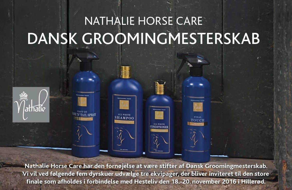 På fem danske dyrskuer i maj, juni og juli vil to repræsentanter fra Nathalie Horse Care udtage finalister til Dansk Groomingmesterskab, som finder sted ved Hesteliv i Hillerød den 18.-20. november 2016. Her vil dommerne kåre den hest, der fremstår mest velsoigneret og smukkest gjort i stand til fremstillingen.