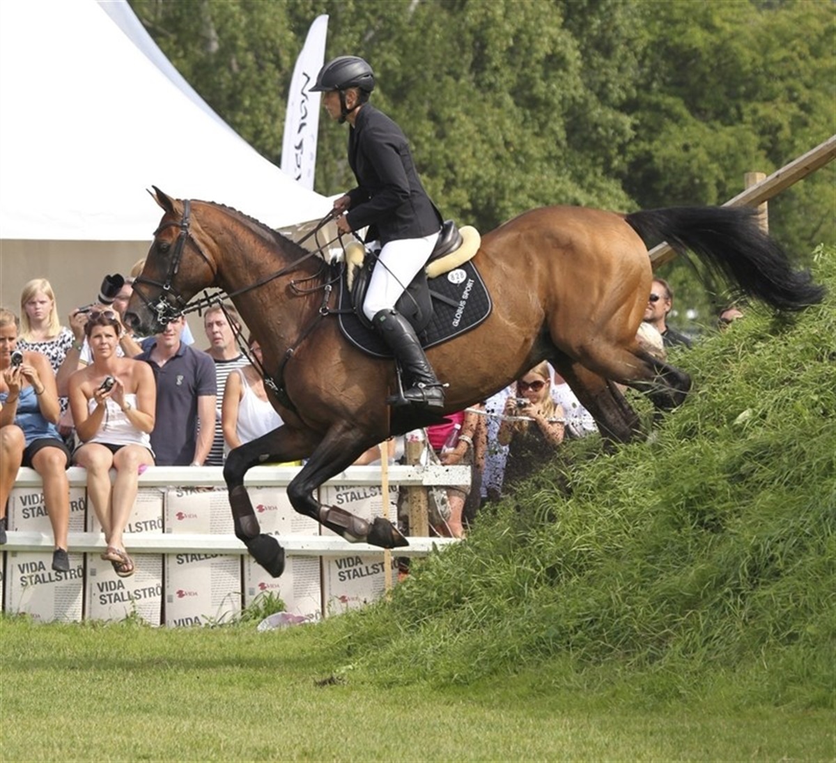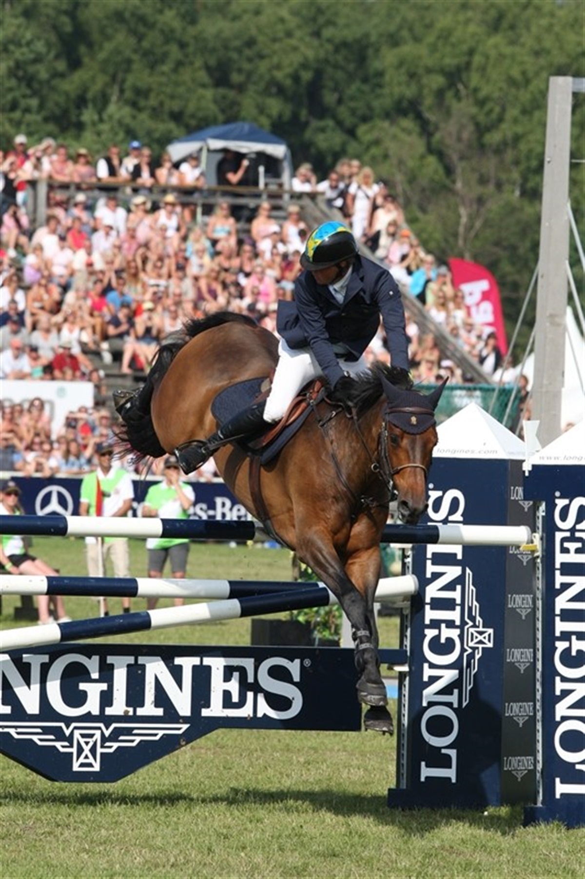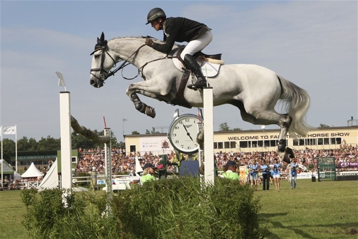 Flere rytter kom ned af bankettet i et kæmpe spring, og det kostede stop eller nedrivning på den efterfølgende lodrette planke. Også udridningen af banen kostede stop. Publikum sad tæt omkring banen, og deres begejstring over Erika Lickhammers flotte ridt med fire fejl på avlshingsten Hip Hop kunne høres langt væk. Falsterbo Derby er fest og stemning, spænding og glæde. Franske Patrice Delaveau og Ornella Mail - en 9-årig hoppe efter den danske varmblodshingst Lando - var de første til at levere en fejlfri runde. Spændingen steg for hjemmepublikummet, da Jens Fredricson og Lunatic klarede alle de vanskelige passager på banen fejlfrit. Da han overvandt den tredjesidste forhindring, det vanskelige naturfarvede dobbeltspring, jublede publikum, to almindelige forhindringer var tilbage. Da Lunatic sprang den næstsidste fejlfrit summede stadion af forventning. Jens og Lunatic sejlede op i luften over sidste forhindring, Jens så sig tilbage, og Lunatic ramte forkanten på oxeren og bommen røg ud af holderen, hvilket resulterede i et brøl fra publikum. Shane Breen og Mullaghdrin Gold Rain sikrede publikum en omspringning, da han red fejlfrit, men i omspringningen fik han allerede et nedslag på nr. to i omspringningen, og så blev sejren fransk, med et lille dansk islæt.