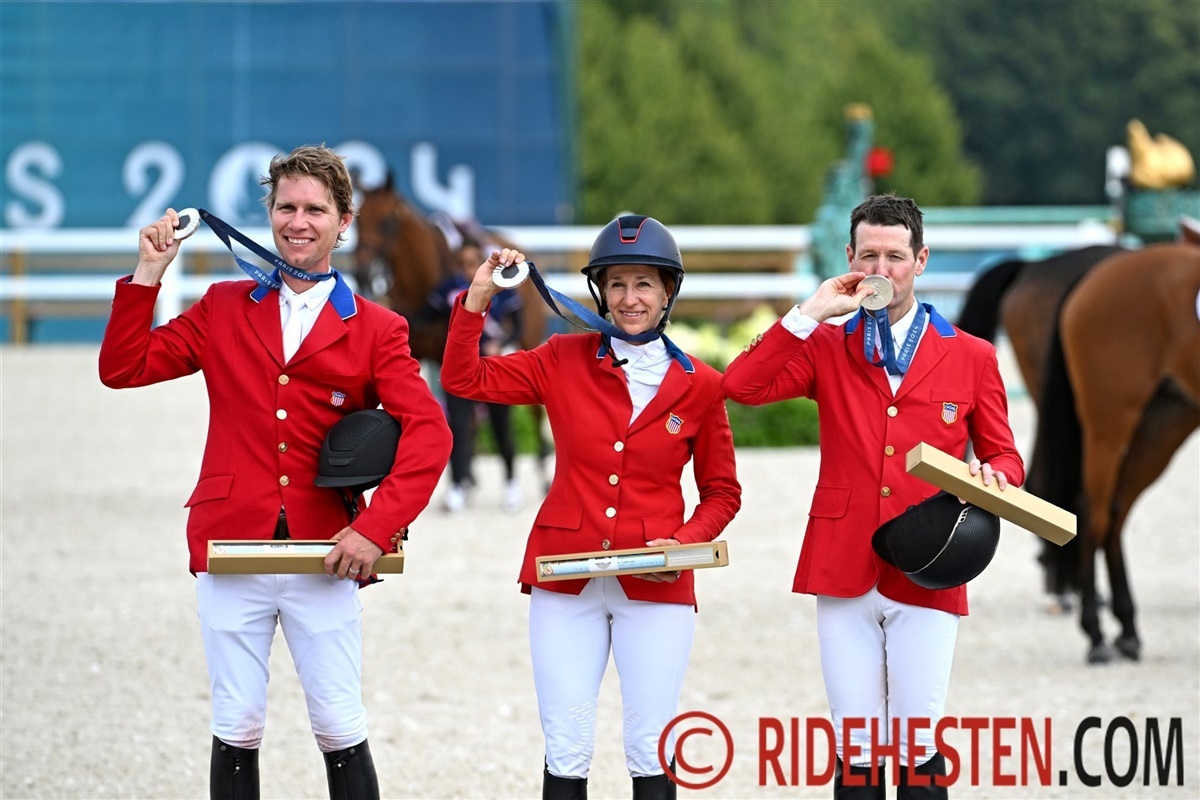 Sølvmedaljen gik til USA, der også vandt OL-sølv i Tokyo. Holdet bestod af Laura Kraut og Baloutinue e. Balou du Rouet/ Landor S, der red med fire fejl. Karl Cook og Caracole de la Roque e. Zandor Z/ Kannan*gfe og Mclain Ward og Ilex e. Baltic VDL/ Chin Chin red begge fejlfrit, hvilket sikrede USA sølv.