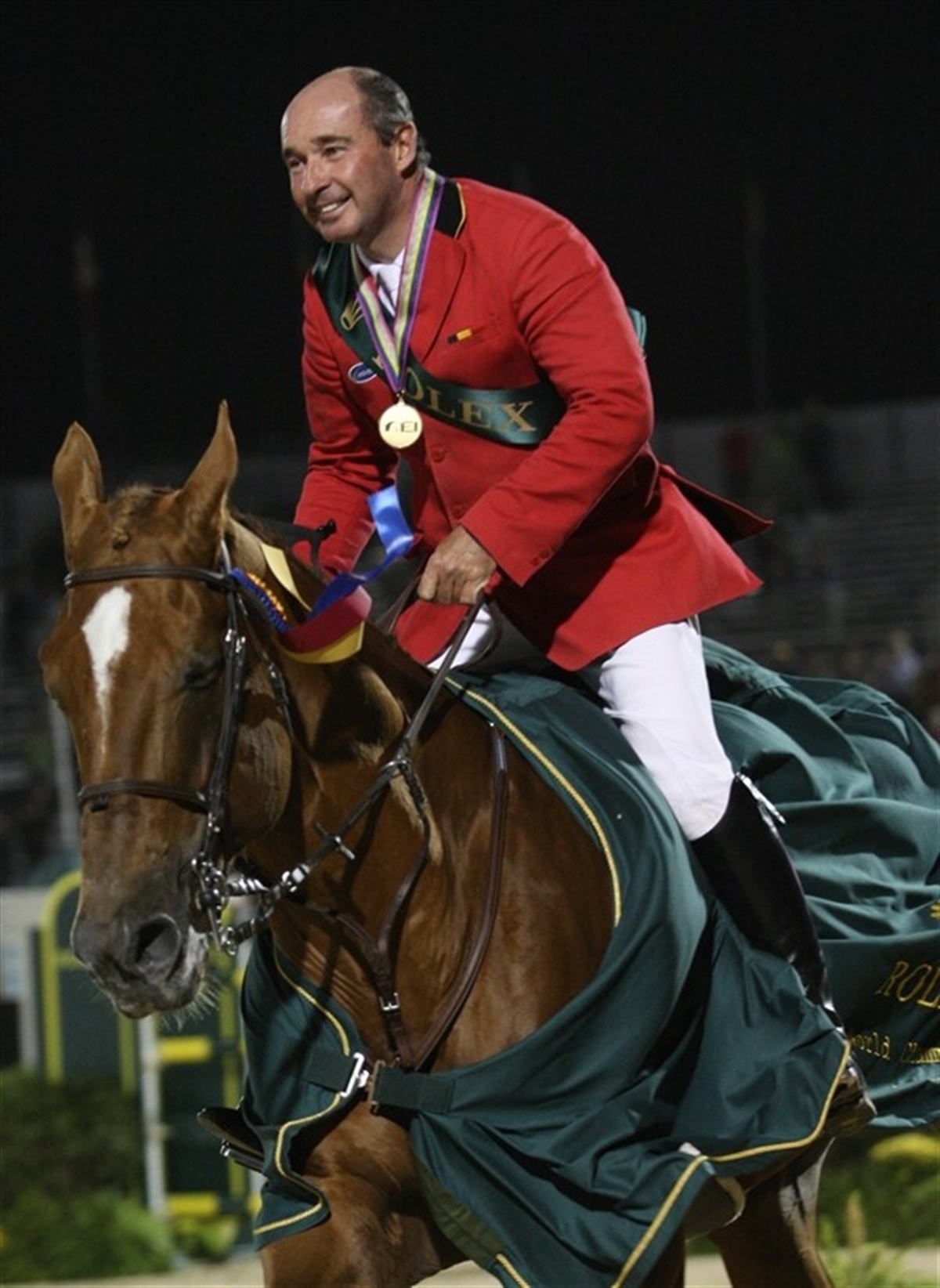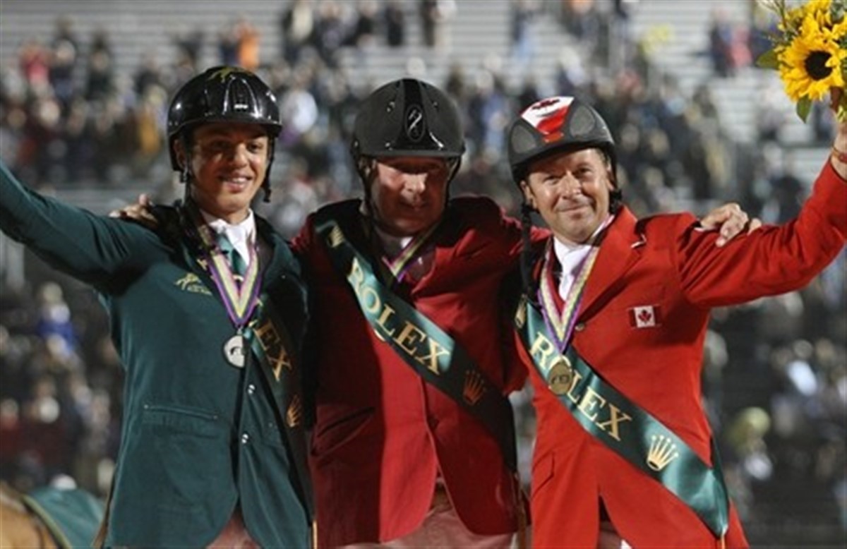Fire verdensdele mødtes her til aften for at afgøre verdensmesterskaberne i springning i en interessant og medrivende hestebyt-klasse. Abdullah Al Sharbatley fra Saudi-Arabien fik 8 fejl på sin egen hest Seldana Di Campalto, men det var de eneste fejl han blev noteret for. Rodrigo Pessoa var uofficiel favorit i hvert fald i pressecentret, men med fire fejl på sin egen hest HH Rebozo og til sidst også otte fejl på Vigo D'Arsouilles røg han helt ud af topkampen og Al Sharbatley vandt sølv. Eric Lamaze rykkede ind på bronzepladsen, han synes ellers tabt for medaljechance, idet han havde fem fejl på HH Rebozo og fire på Seldana Di Campalto. Det var dog belgiske Philippe Le Jeune, som imponerede hele aftenen, med fire flotte runder. Først på sin egen velspringende Vigo D'Arsouilles - og dernæst på samtlige konkurrenters.