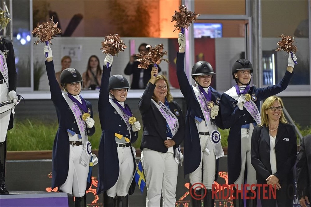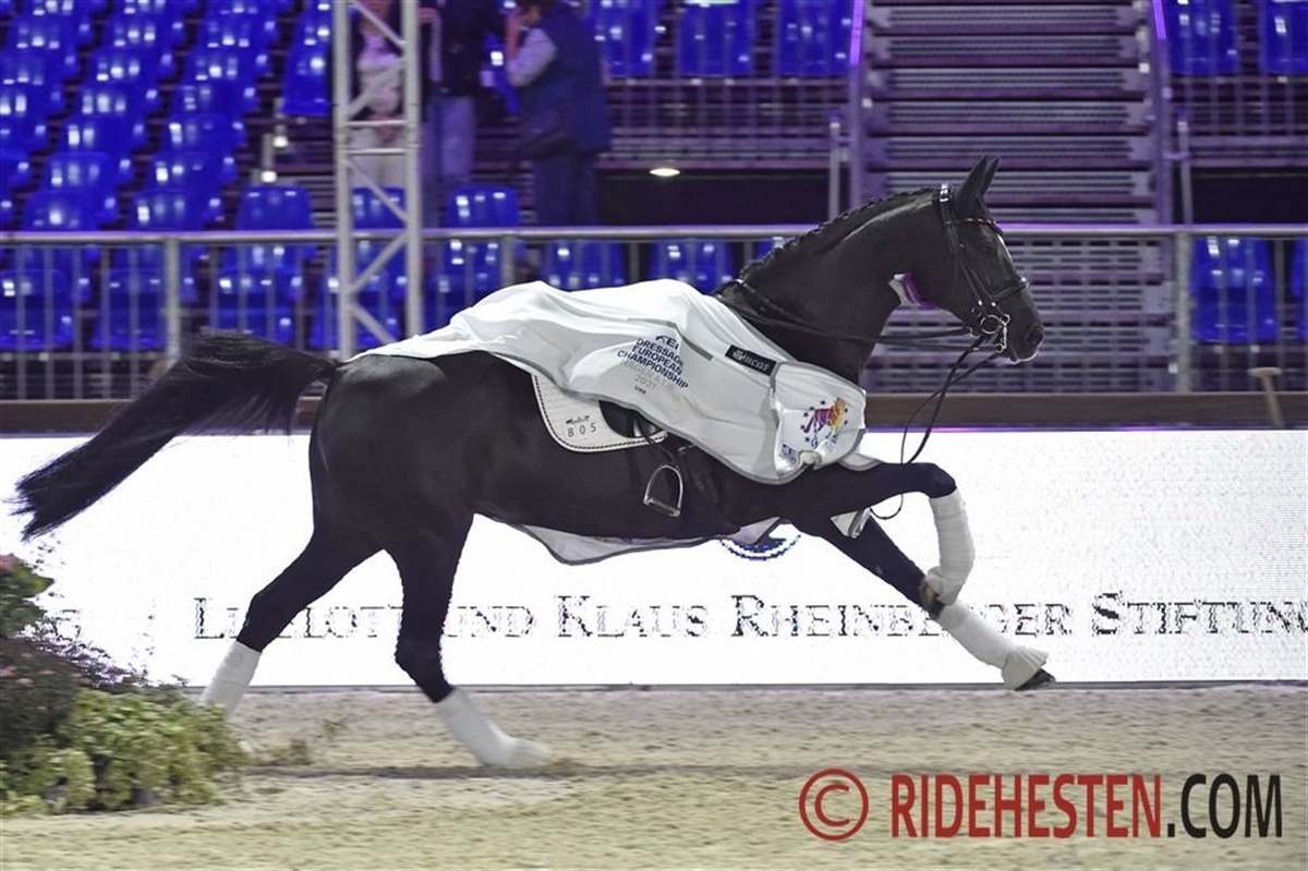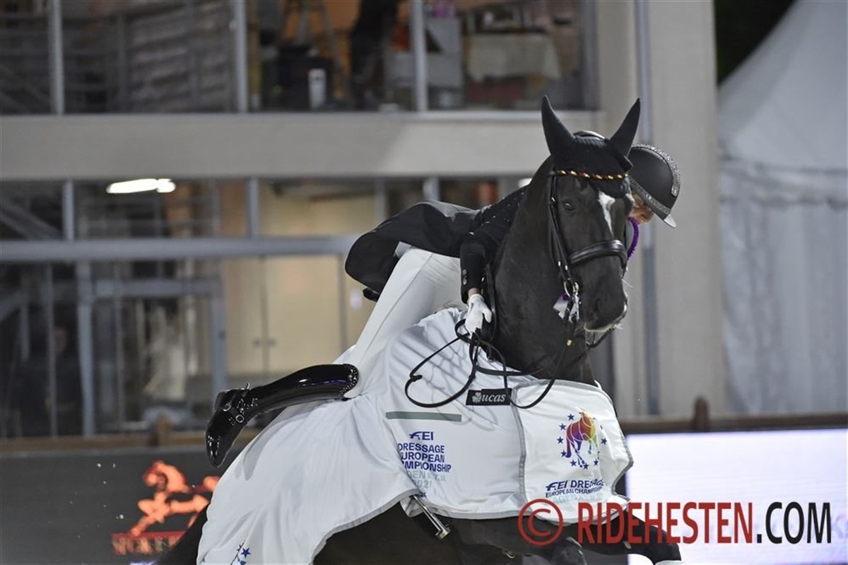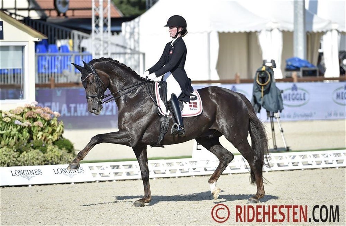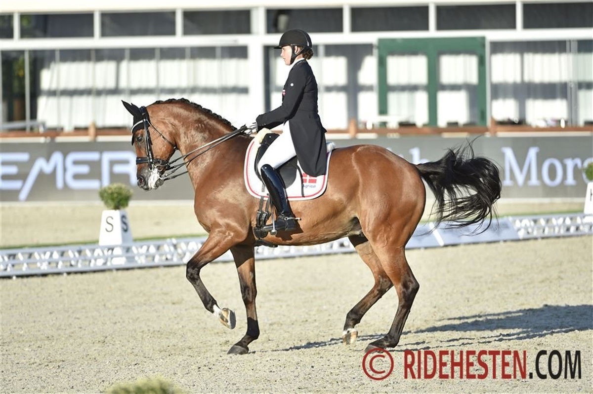 I går lagde Emma Skov og Kathrine With Petersen ud med to stabile ridt som man kan læse mere om HER og i dag var det så op til Josefine Hoffmann og Victoria E. Vallentin at gøre dem kunsten efter. Det er kun få måneder siden at 17-årige Hønnerups Driver e. Blue Hors Romanov/Blue Hors Don Schufro (opdr. Stutteri Hønnerup) fik pådraget sig en alvorlig øjenskade, som man kan læse mere om HER. Normalvis har Driver godt af at komme ud og ride rusten af sig inden vigtige mesterskaber, men det har af gode grunde ikke været mulig for ham og Josefine. Dagens ridt bar lidt præg af at Driver blev lidt for glad for endelig at være afsted igen og mens at piaff-passage turen fungerede bedre end normalt, så indløb der nogle fejl rundt omkring. Det samlede resultat blev 67,52% og på daværende tidspunkt var det også nok til at holde Danmark inde i kampen om bronzemedaljen.