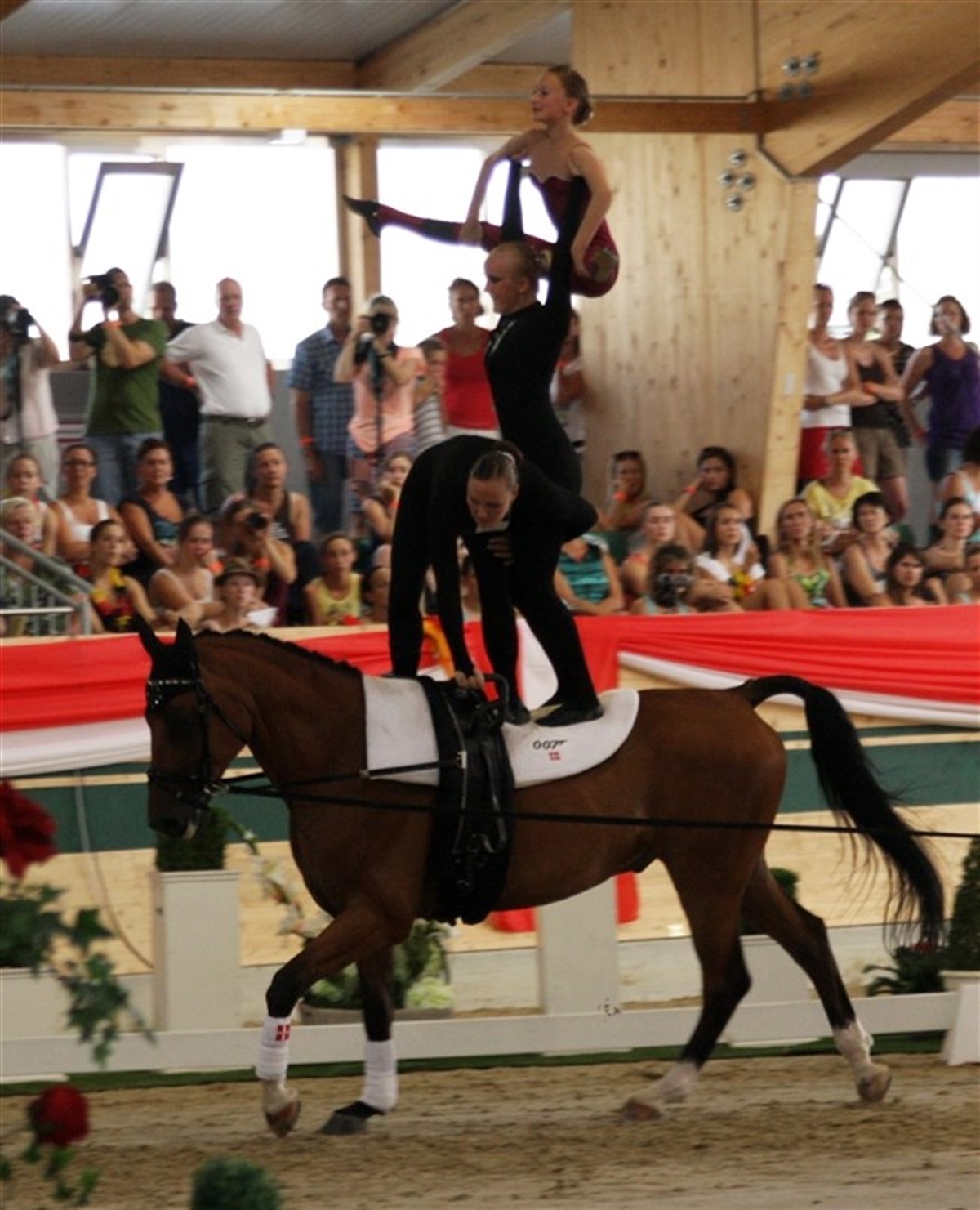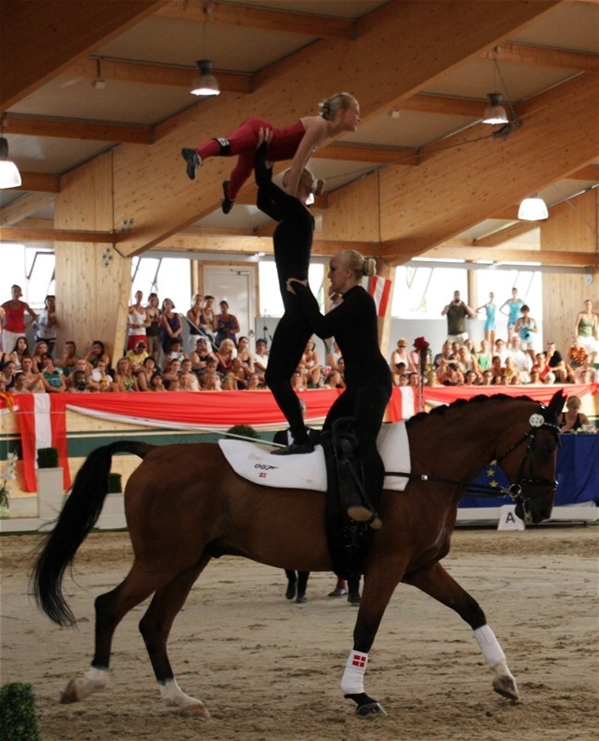 Møllebakkens hold var også på banen i dag med deres frie program med longefører Lise-Lotte Bjarndahl og hesten Fabiano. Holdet har senest i Aachen vist, at de er stærke i det frie program. Teamet leverede en sikker og stabil præstation, hvor den eneste rigtige fejl opstod, da Fabiano snublede på bagparten, og pigerne kom lidt hurtigere af hesten end planlagt. Men efter Fabiano kom i gang igen kørte de en rigtig flot og sikker afslutning, og de blev belønnet med en flot 5. plads i dagens runde. Dermed rykker Danmark forbi England i den samlede stilling op til en 6. plads, og de er kun 0,1 point efter svenskerne på 5. pladsen. Medaljerne vil blive fordelt mellem Tyskland, Østrig, Frankrig og Schweiz, som har lagt tydelig afstand ned til de efterfølgende pladser, men Danmark har alle muligheder for at opnå en flot 5. plads i det hårde selskab.