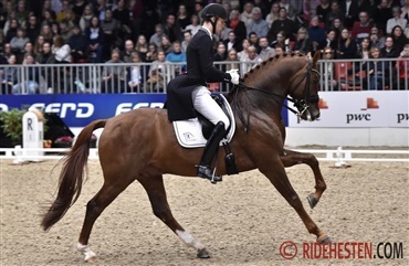 Igen kl. 12.46 er det muligt at se Daniel Bachmann Andersen på den 8-årige hingst Blue Hors Veneziano e. Vivaldi/Donnerhall til Louisdor-Preis finalen 2018. Det er en slags kort Grand Prix-klasse for yngre heste, og makkerparret vandt da også kvalifikationsklassen i Horses & Dreams i Hagen.
