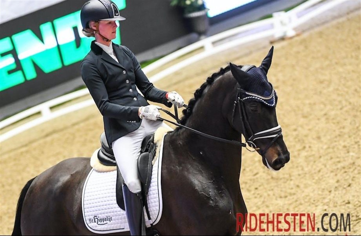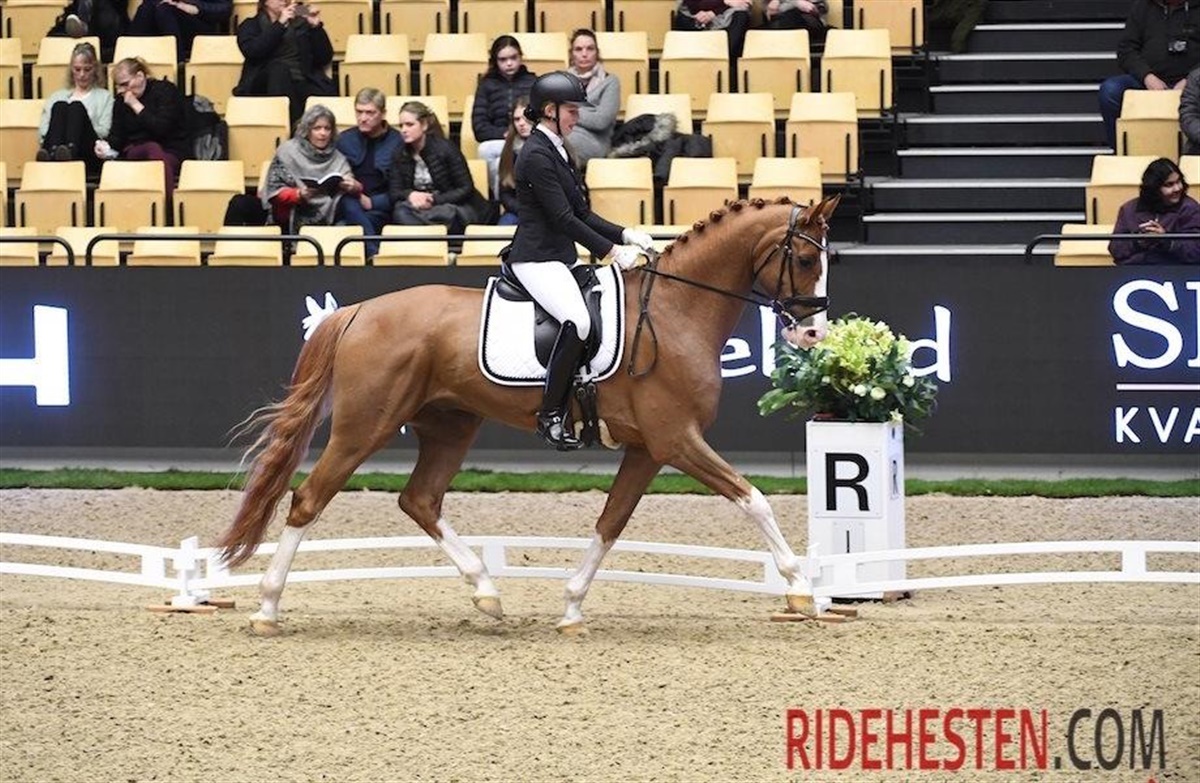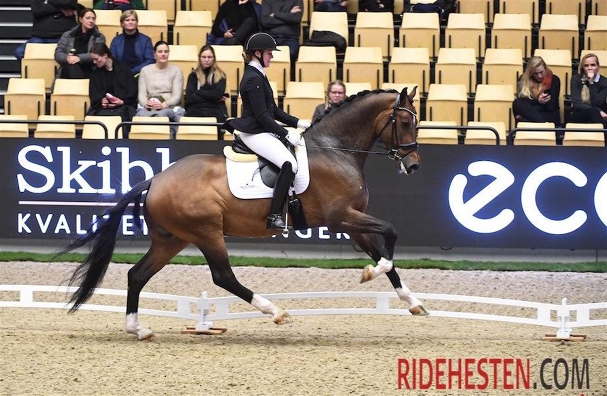Det blev den nydelige sortbrune hoppe Logo's Gaya e. Grand Galaxy Win/Blue Hors Don Romantic (opdr. Jette Fries) redet af Emma Ahlberg, der vandt B-finalen i dressurchampionatet for 5-årsheste ved Dansk Varmblods Hingstekåring i Herning i år.