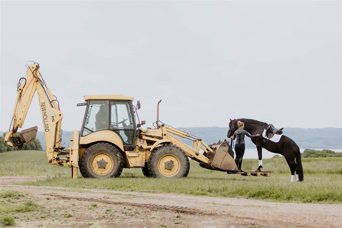På billedet nedenunder kan Baldi (Blue Hors Zack/Gribaldi) ses, hvor han bliver løftet af rendegraveren. Det er anden gang, han prøver at have forbene på en plade og blive løftet, men fordi han har en forståelse for signalerne, og resten af opgaven er ”brudt” ned forinden, og han generelt er tilpas i sin krop og hviler i sig selv (er tryg ved rendegraveren, tryg ved at stå på fremmede objekter osv.), så er det relativt nemt at sætte sammen, også selvom han er en følsom hest. Her er rendegraveren bare et eksempel, men det kan også være at lære hesten at gå i trailer, gå forbi et farligt dommertårn, at tage hesten med ud til undervisning eller stævne for første gang, frygt for vand, kan ikke stå stille ved opstigning osv.