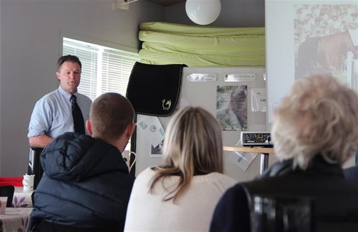 Dagen startede kl. 10 med en times teori i rytterstuen. Johnny fik fortalt en masse om de vigtige egenskaber ved springhestene, og man havde en rigtig god debat i åbent forum. Johnny gennemgik også det nye bedømmelsesskema og forklarede, hvordan dette kan bruges som en stor hjælp til hoppeejerne, når de for eksempel skal vælge hingst.
