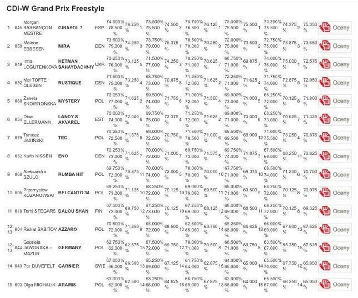 Mens sejren i dag gik til panske Morgan Barbançon og Girasol e. Gribaldi/ Landioso med 75,350%, så tog gårsdagens danske vinder, Malene Kohlschmidt Ebbesen og Mirá e. Michellino/ Cavan (opdr. Børge Thomsen), andenpladsen med 73,650%, selv om Malene ikke er helt vild med at ride kür. Mon ikke hjemrejsen synes knap så lang med en første- og en andenplads i bagagen.