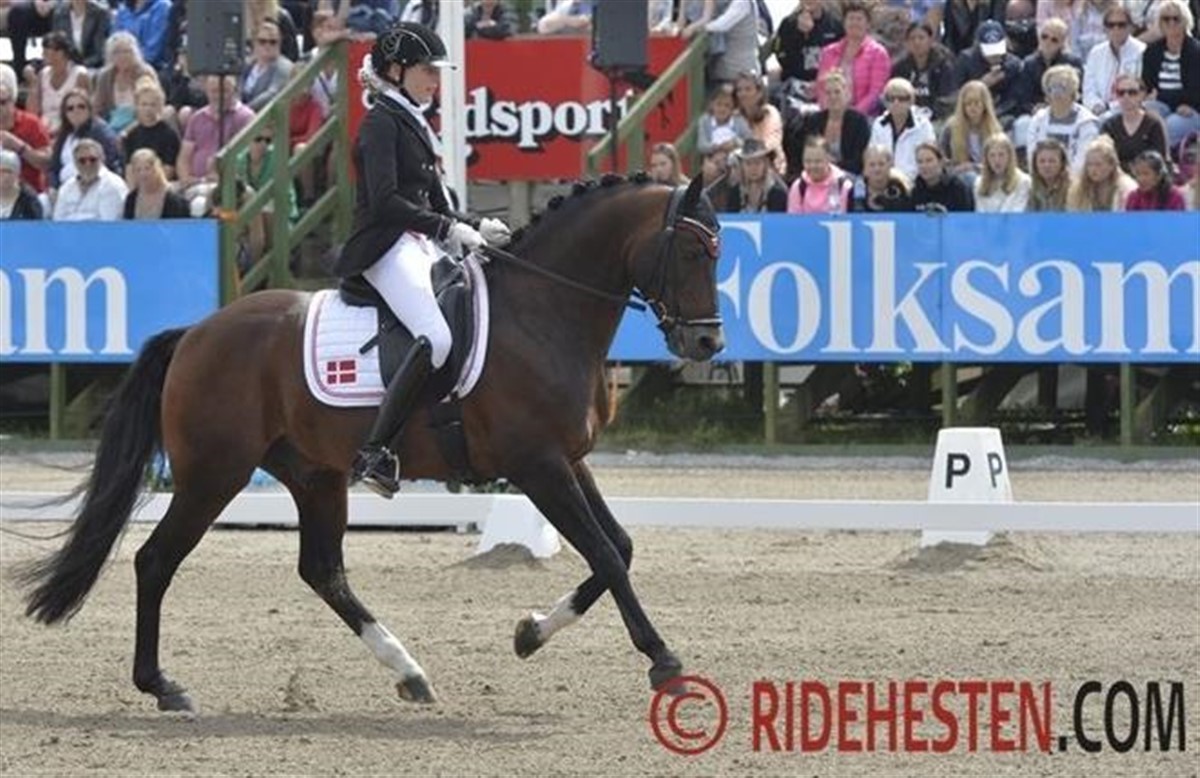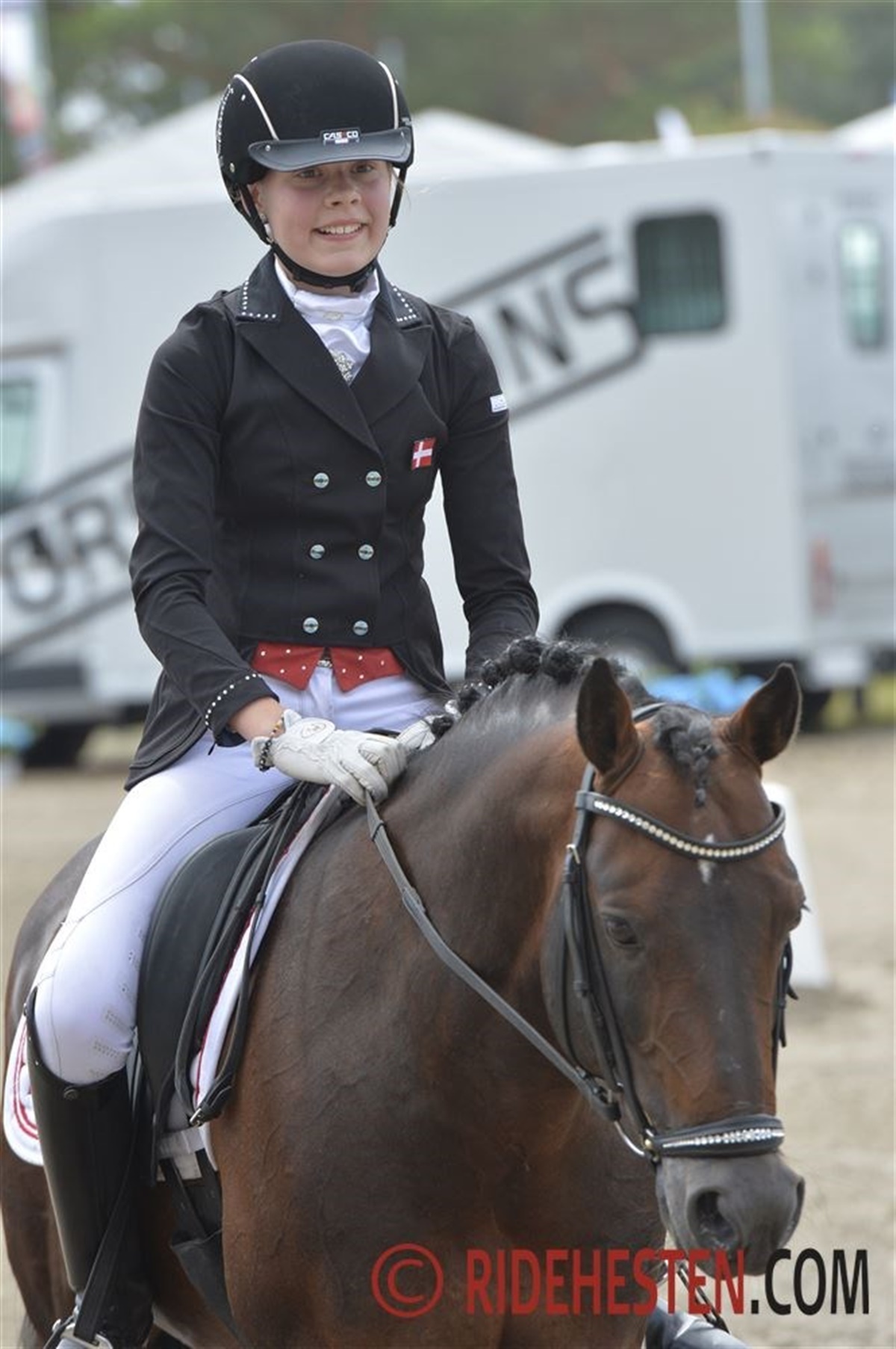 13-årige Maria Mejlgaard Jensen var nok mere imponeret af omgivelserne inde på dressurstadion end hendes erfarne superpony Bjerregaards Mozart, der tog de tusindvis af tilskuere, blomsterne og musikken med knusende ro. - Han er mega sød, og han kigger ikke på noget, fortalte Maria om sin pony. Maria rider sit første år på kat. I pony, hun er regerende dansk mester for kat. III, og det er meget anderledes at ride en stor pony, fortæller hun. Hun var meget imponeret af stævnepladsen og de mange tilskuere, men Mozart reagerede ikke på omgivelserne, han var koncentreret om sin rytter. I en overgang fra en øgning på en kort diagonal skulle Maria fortsætte af langsiden i kontragalop, så hun gav lige Mozart lidt mere støtte med sin schenkel med det resultat, at han resolut sparkede ud, og faldt ud af galoppen. Maria fik hurtigt reddet situationen, og kom videre i sin flotte kür. Sammen med sine forældre har Maria selv sammensat sit kürprogram, men genbrugt noget af den musik, som hun red til med sin kat. III pony Thers Hey Harlekin. Det er noget musik hun kan lide, og så har Lis Christensson sammensat den musik til hendes program. I Falsterbo var det blot anden gang Maria red sit kürprogram. Det er især i øgningerne, Maria og Mozart opnår deres points, fortæller Maria. - Ja og så hader du at ride travers, indskød hendes mor og den udtalelese protesterede Maria ikke imod. Maria og Bjerregaards Mozart sluttede på fjerdepladsen. Der var stor dommeruenighed om hendes præstation, hvor een dommer så hende som en klar vinder af klassen og gav hende 74%, mens en anden så hende på fjerdepladsen til 68,25% hun opnåede 70,70% og klassen blev vundet af Elin Mattsson/Bodo med 72,667%