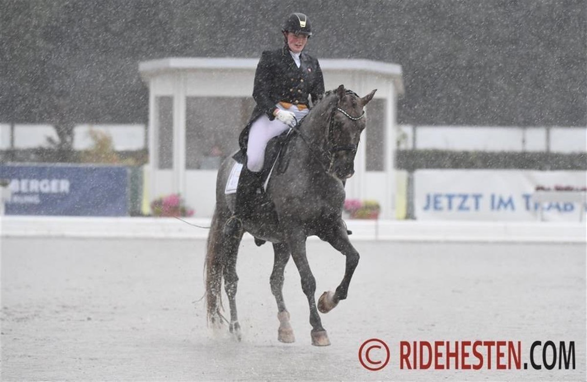 I dag var det så Maj-Britt, der fik sig en ordentlig byge under hele sit ridt på Dior. I dag avancerede Frida til en andenplads i Intermediare I med knap 68%. Hun fortæller her om sit ridt i et skybrud i går: