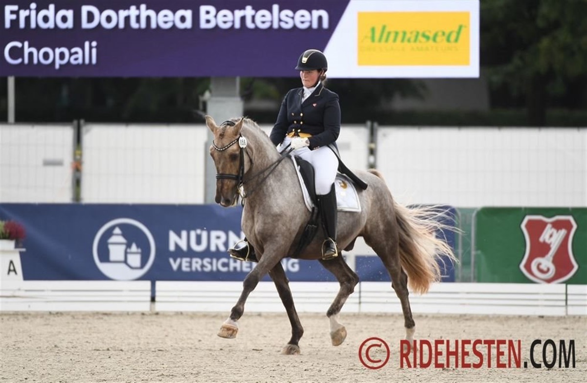 To danske ryttere har redet Almased amatørturen her i Verden, hvor Maj-Britt Clayton/Dior og Frida Dorthea Bertelsen/Chopali er til start. I går red de Prix St. Georges og i dag Intermediaire I.