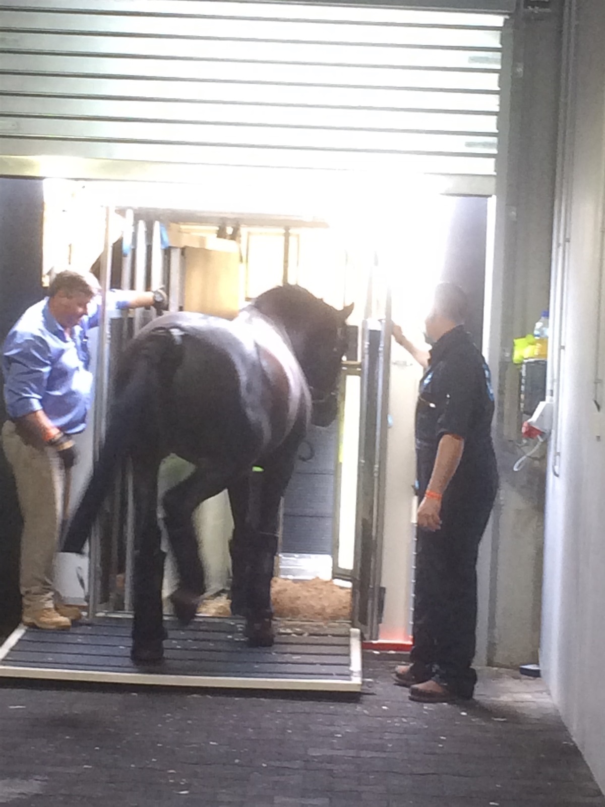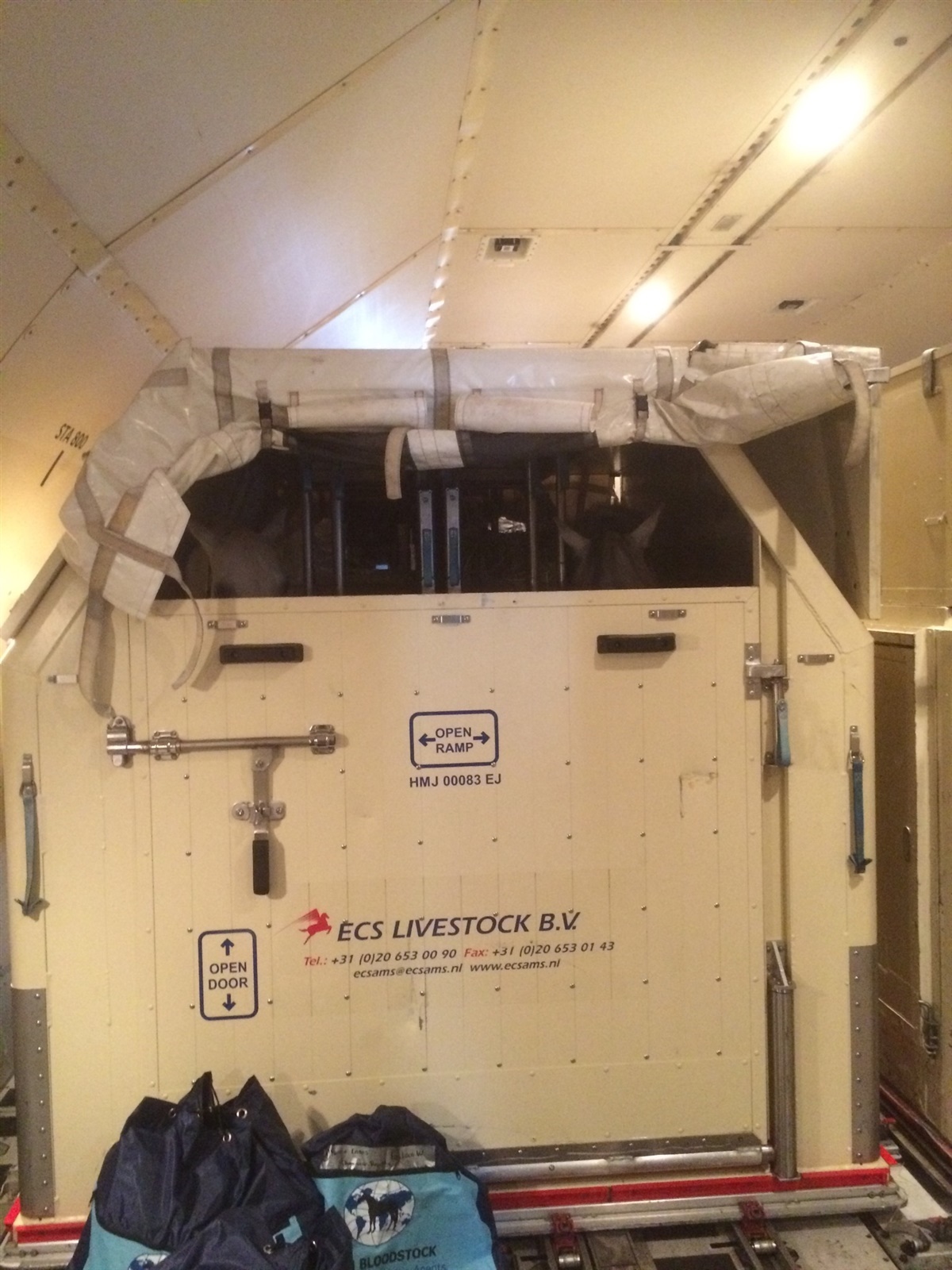 Efter take of lavede vi de danske hestes containere om, så de kunne stikke hovedet ned og spise, hvilket er rigtig godt for deres luftveje på sådanne en lang tur.