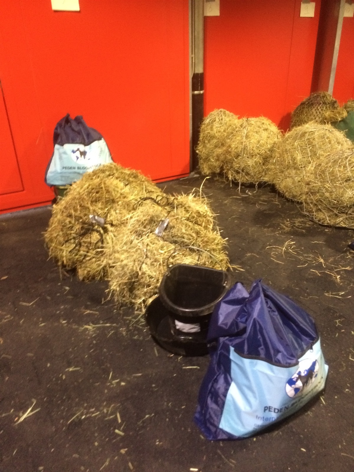 Vi gik rundt med hestene i staldområdet i lufthavnen, og så fik de deres aftensmad. Formiddagen bruge jeg til at gå med alle hestene, og få skrevet de sidste navne på de ting, der skulle med flyet (krybber, hønet osv.)