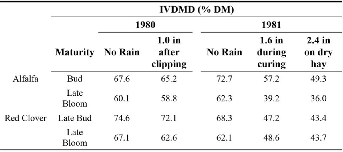 I et tredje studie faldt der 2,4 inches eller 6 cm regn, efter høet var tørret, og det gav en endnu dårligere foderværdi, helt ned til 36% af den oprindelige i sent blomstrende lucerne, som var blevet ødelagt af regnen.