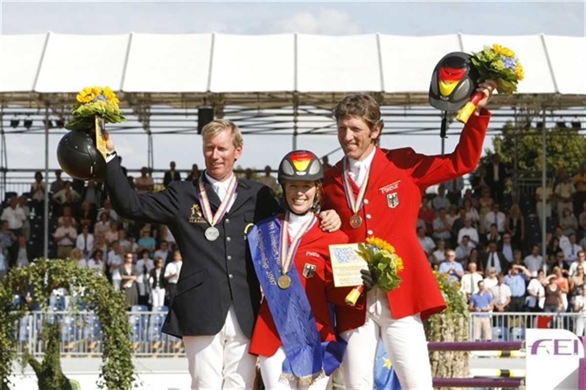 Meredith Michæls-Beerbaum og Shutterfly kronede et flot mesterskab med fem fejlfrie runder med et europamesterskab. Den regerende verdensmester Jos Lansink fra Holland og Cavalor Cumano havde heller ikke en eneste bom nede under mesterskabet og sluttede med de fejl han opnåede efter omregningen af placeringerne i tidsspringningen til fejl. Ludger Beerbaum var så heldig, at Christina Liebherr og norske Morten Djupvik fejlede, så det nedslag han fik i første runde i dag kun betød at han tabte sølvmedaljen og vandt bronze. Læs meget mere om EM i det kommende nummer af Ridehesten.