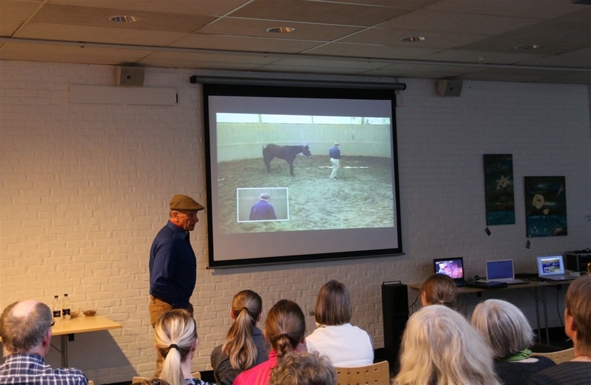 Dyrlæge Lotte Lysemose Knudsen indledte aftenen med en velkomst og introduktion af DSVK og veterinær kiropraktik. Der var specielt fokus på funktionaliteten af nervesystemet, og hvordan der arbejdes med optimering af dette, ved kiropraktiske behandlinger. Derefter blev der lagt op til at tale om den adfærdsmæssige del, og håndtering af hesten, som Monty Roberts udførte med stor ildhu, humor og enorm indsigt i både heste og mennesker. Der blev vist dokumentarfilm, både nogle af ældre dato, men desværre også af nyere dato, hvor det illustrerer hvilken stor grad af vold der til stadighed anvendes i ”tæmning” af heste på verdensplan. Heldigvis er Danmark et land hvor vold af den karakter ikke benyttes, men muligheden for at forfine håndteringen af hesten og øge forståelsen af flugtdyret, samt mindske stress for både ejere og heste blev meget detaljeret beskrevet. Det handler i bund og grund om kontrol af egen krop og timing.
