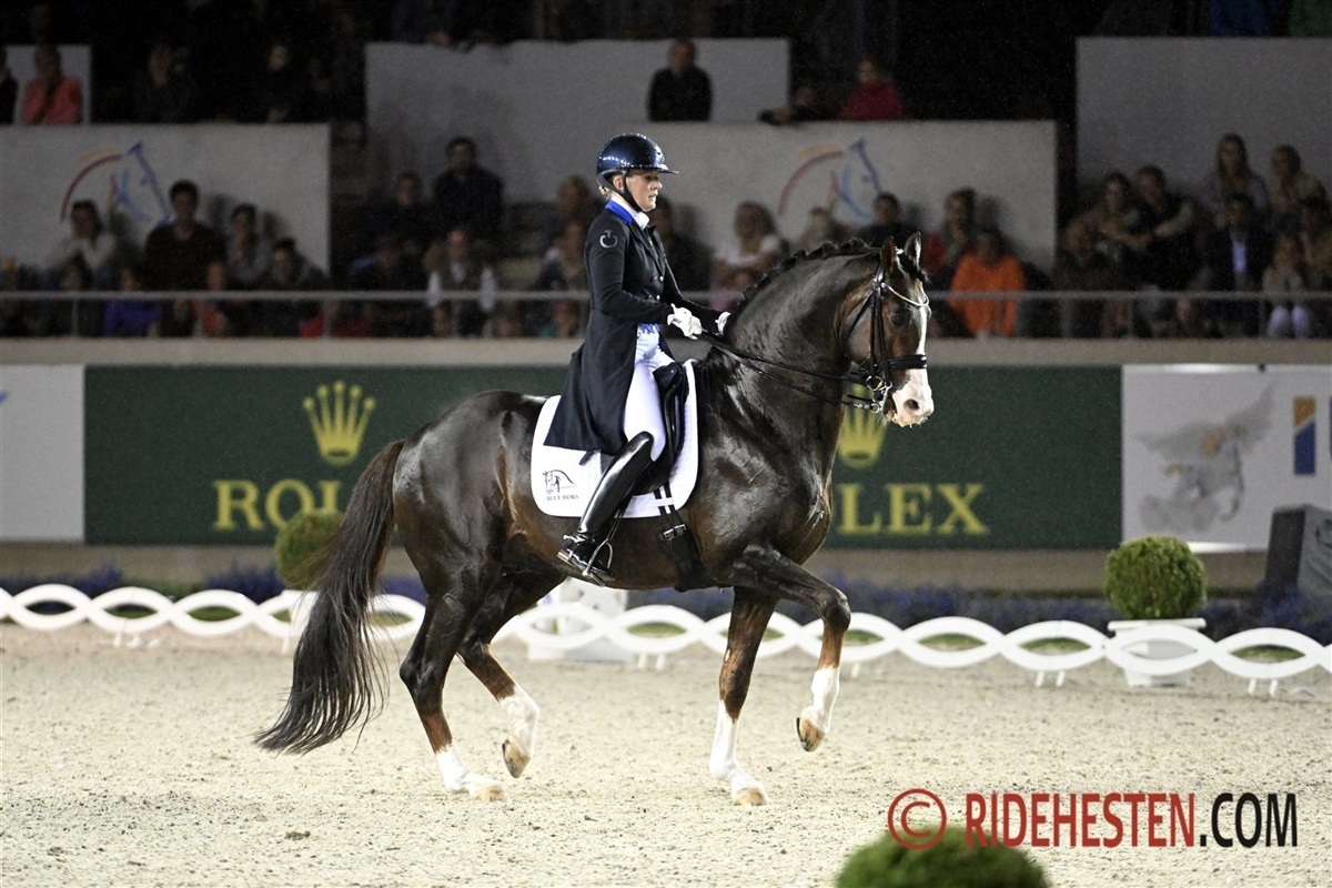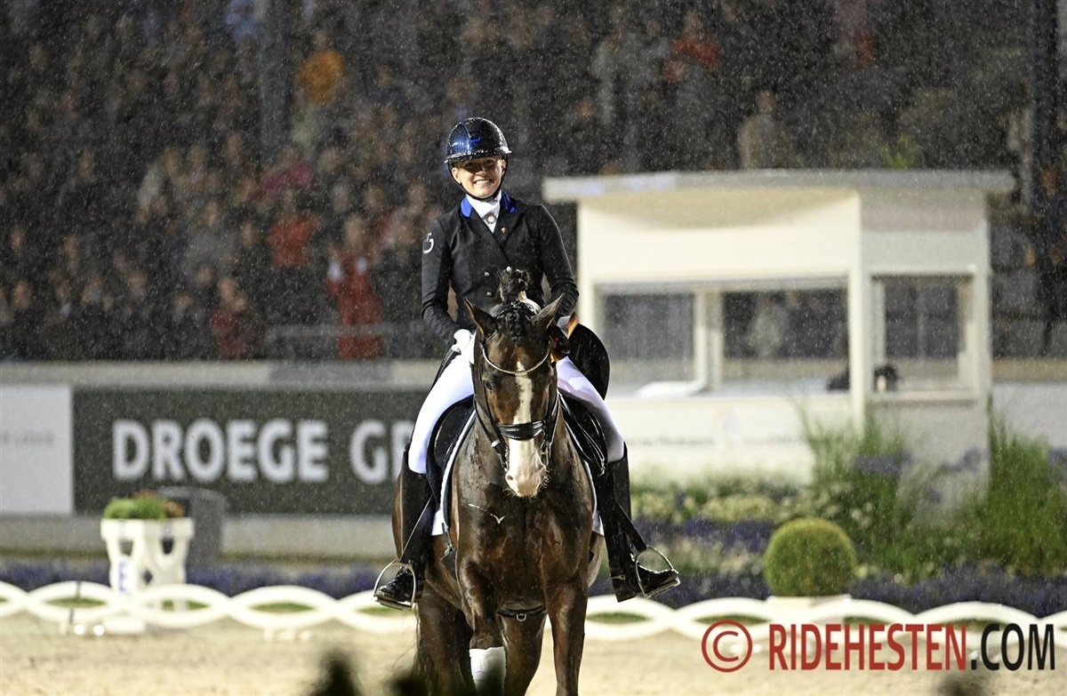 Regnen silede ned her til aftens mens rytterne red kür, men humøret fejlede heldigvis intet på trods af vejret. Med Blue Hors Don Olymbrio e. Jazz/ Ferro red Nanna klokken 22.21 på banen for at ride CDI4* kür og den 15-årige avlshingst bliver bare bedre og bedre under Nanna, som hele tiden formår at tilpasse sig til den hest hun sidder på. Det er et imponerende sammenspil hun har fået med hingsten og i dag gik alt efter bogen i en fantastisk kür uden fejl. Med 82,85% brød ekvipagen for første gang 80% grænsen og hvilket sted og dag at gøre det på!