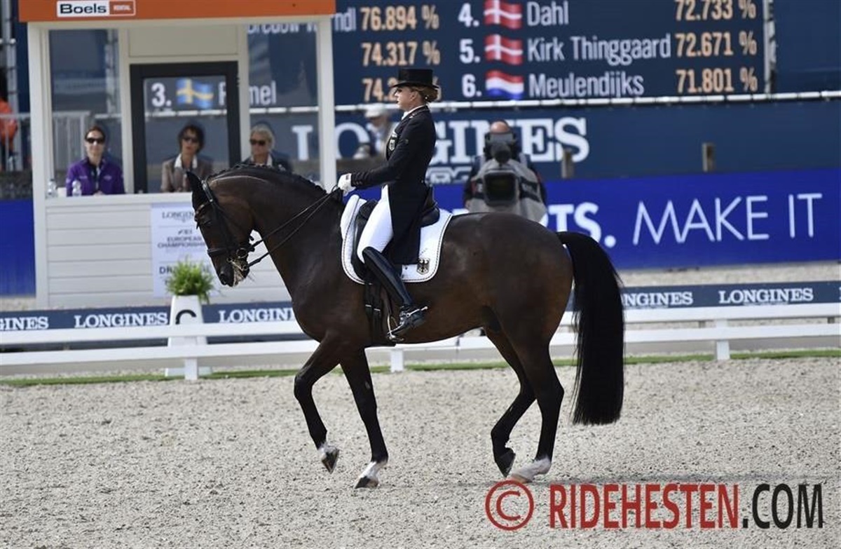 Det er ikke uventet tyskerne, der har lagt sig i front, men det har ikke været uden problemer, for de så stærke tyske ryttere. Jessica von Bredow-Werndl havde spændt buen lidt for hårdt på trakehnerhoppen TSF Dalera BB, der gødede i den anden traversade og totalt tabte takten. Spændingen tog til efter dette, men da hoppen samtidig laver mange flotte øvelser, så nåede de alligevel 76,894% Dorothee Schneider har Showtime FRH e. Sandro Hit tilbage i konkurrence efter to års skadespause. Hun var ved at puste til landsmanden Isabell Werth i Aachen, men i dag var der lidt spænding og nervøsitet at spore hos ekvipagen, og Showtime gik næsten i stå i den første piaffe. Alligevel scorede de 80,233%