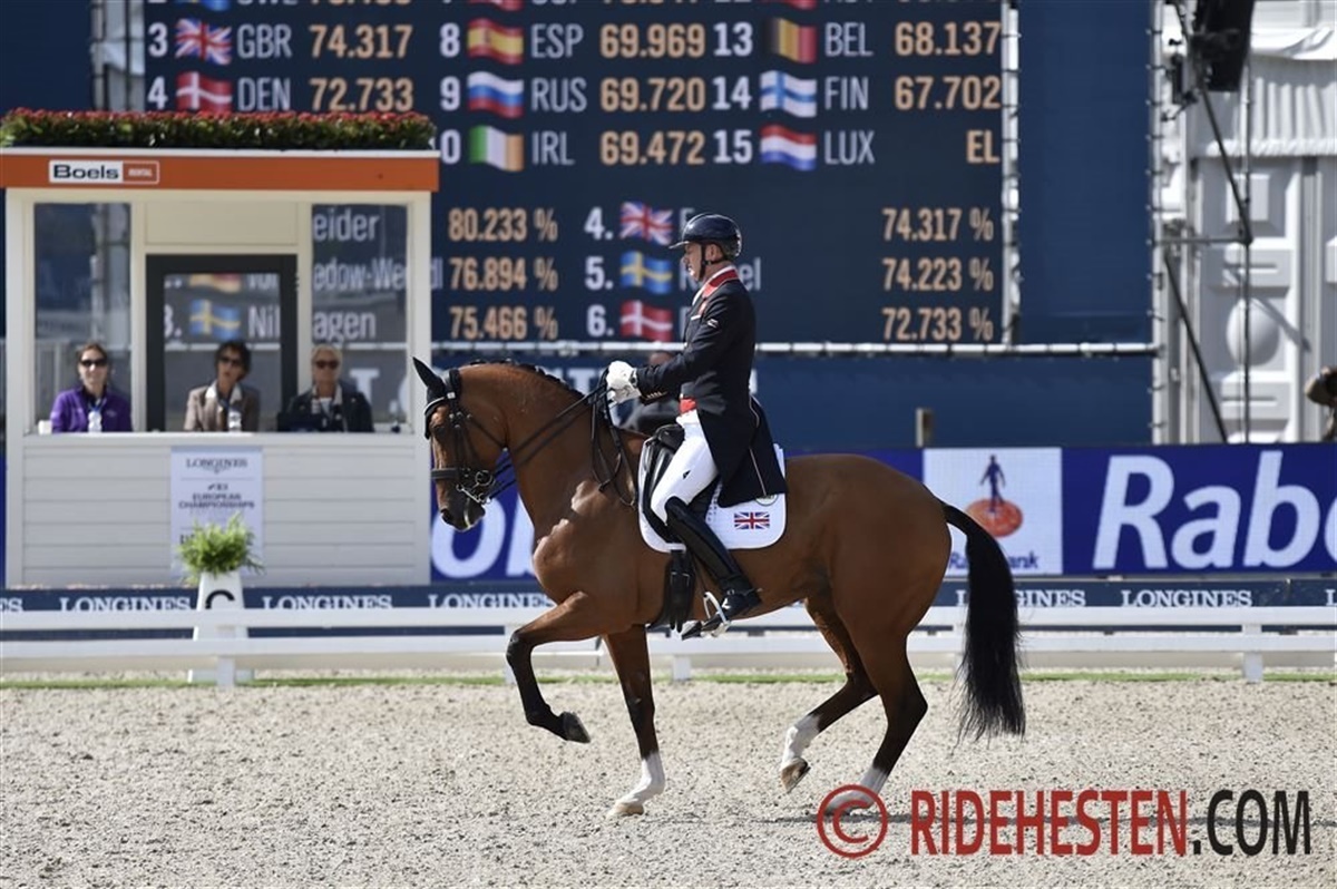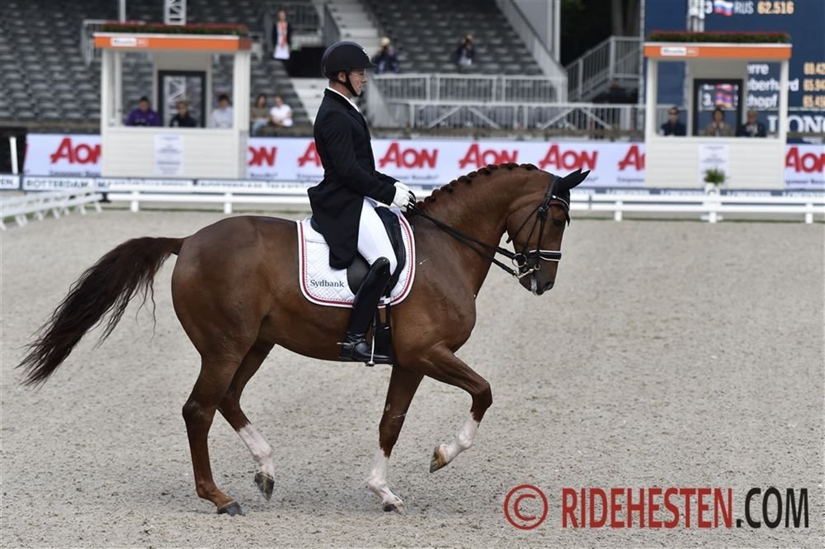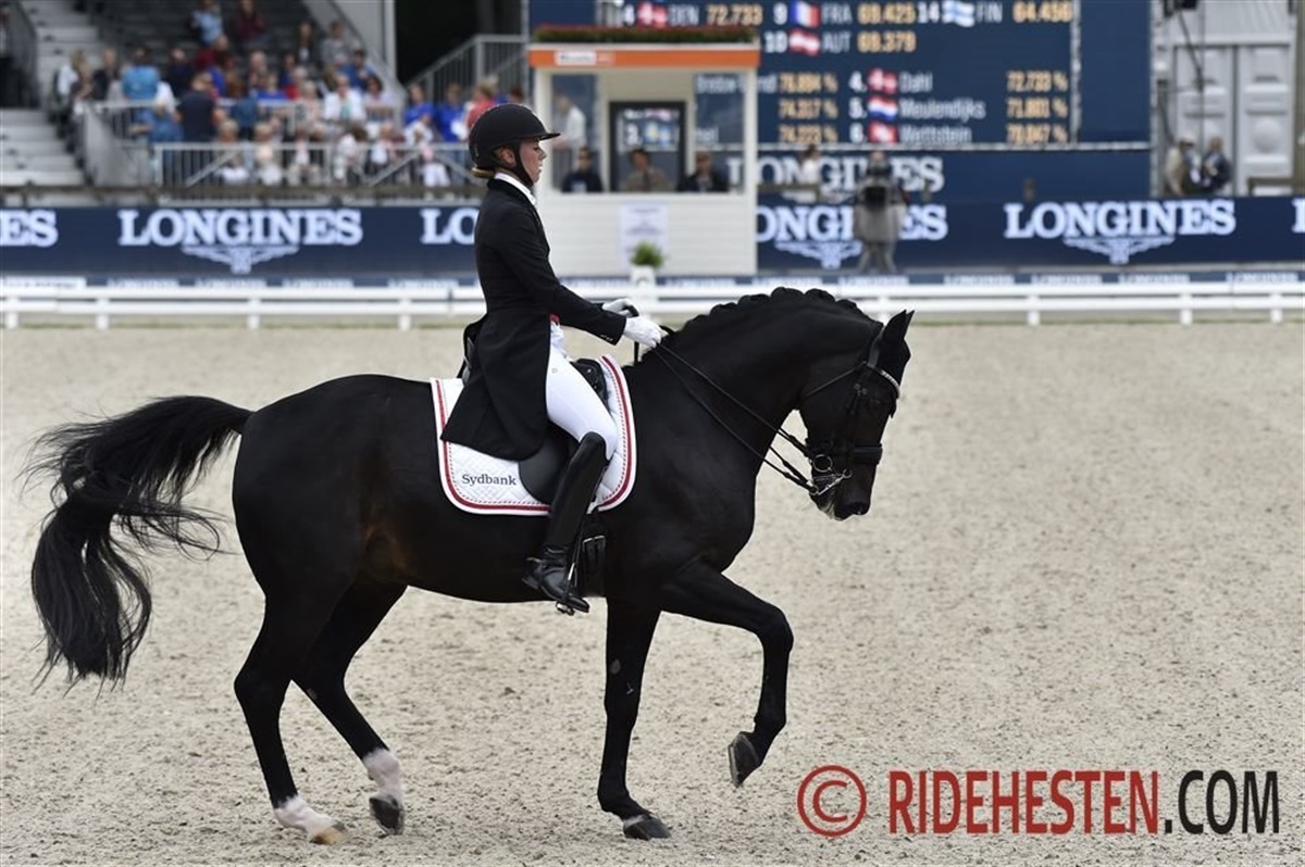 Individuelt slutter Anders Dahl (hør ham fortælle om sit ridt HER) og Agnete Kirk Thinggaard (hør Agnete fortælle om sit ridt HER) på hhv. 8. og 9. pladsen inden holdkonkurrencen afgøres tirsdag, hvor Daniel Bachmann Andersen og Blue Hors Zack åbner for Danmark kl. 8.40 og Cathrine Dufour med Atterupgaards Cassidy går på banen kl. 11.50, og så har vi blot tilbage at afvente de sidste ridt fra Sverige, England og Holland, før vi kender resultatet omkring kl. 15.15.