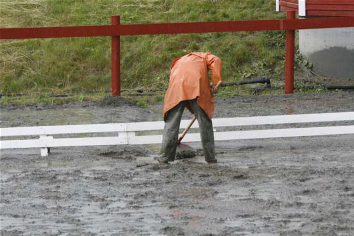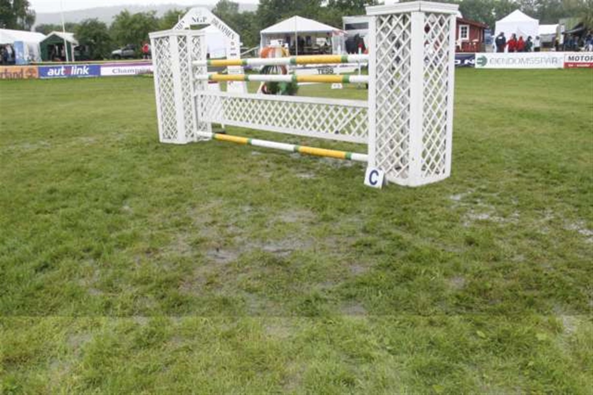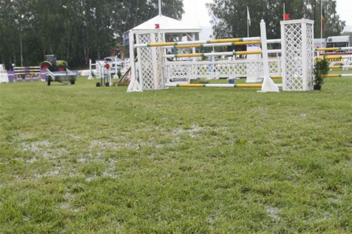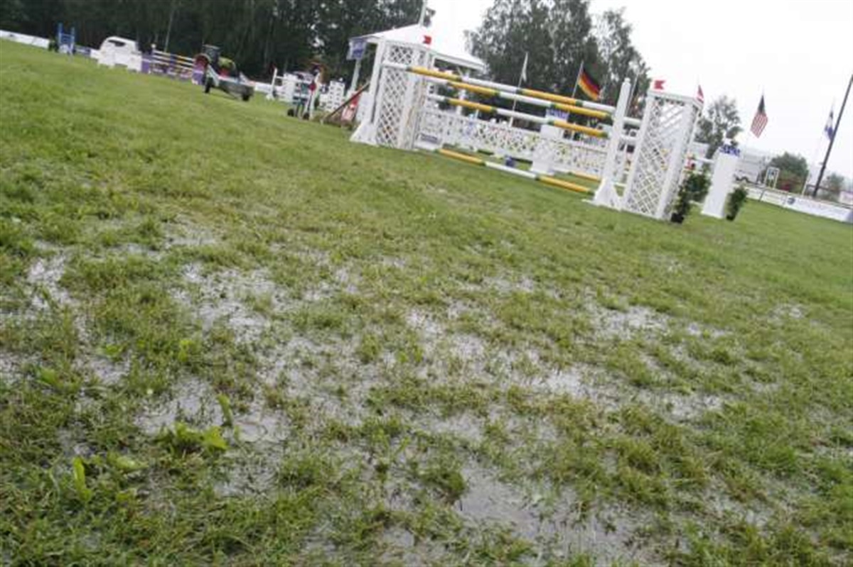 Uafbrudt regn i stride strømme siden fredag har gjort, at stævnearrangørerne i samråd med rytterne er blevet enige om at aflyse alle konkurrencer resten af lørdagen. Billederne er taget i den store arena og viser, hvor høj "vandstanden" efterhånden er blevet. Søndag kl. 07 starter finalen i dressur. Kl. 10 starter springning i 1,40 klassen. Kl. 13 starter Nations Cup. Nations Cup og Grand prix'et er nu slået sammen i en og samme klasse - dels for at kunne nå det hele, dels pga. banens tilstand. Ridehesten følger sagen nøje.