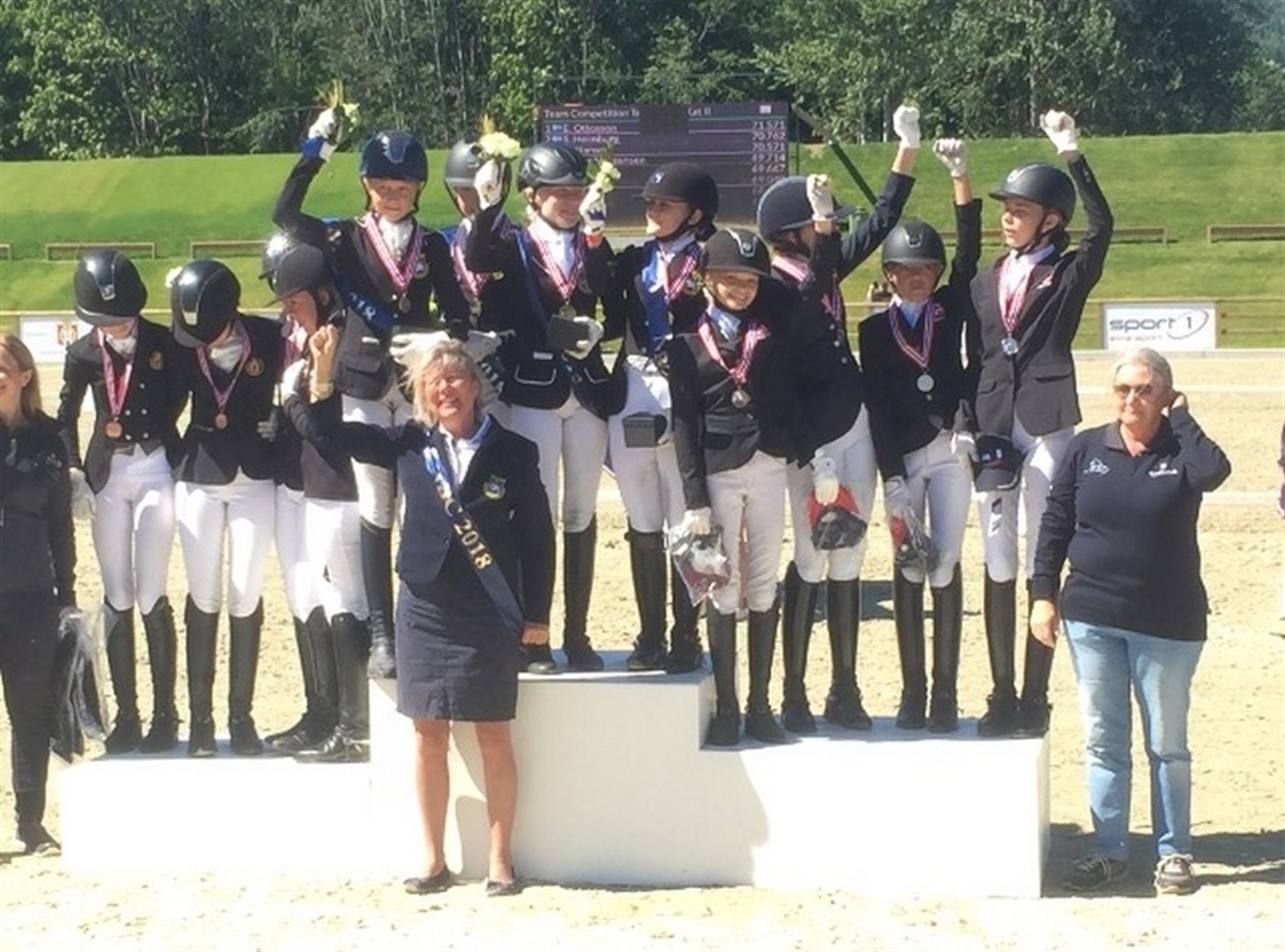 Dagen efter skulle ponyerne i Vet check. Jette fortalte os, hvordan vi skulle trække dem, for det havde vi jo ikke prøvet før. Heldigvis gik alle de danske ponyer igennem. Dagen efter gik konkurrencen i gang. Første klasse var en opvarmningsklasse. Jeg var så nervøs, at jeg kastede op inde i programmet, men heldigvis er Aurora en kæmpe kammerat, så hun gik bare videre og vi gennemførte. På andendagen skulle vi ride PRT, det var holdkonkurrencen, det gik rigtig fint for os alle, og vi fik sølv. Etterponyerne fik guld og Jette og Rigmor roste os alle sammen. Vi fejrede det med sodavand og chips i stalden. Det var mega sejt at ride ind på det store ridestadion og få medaljer.