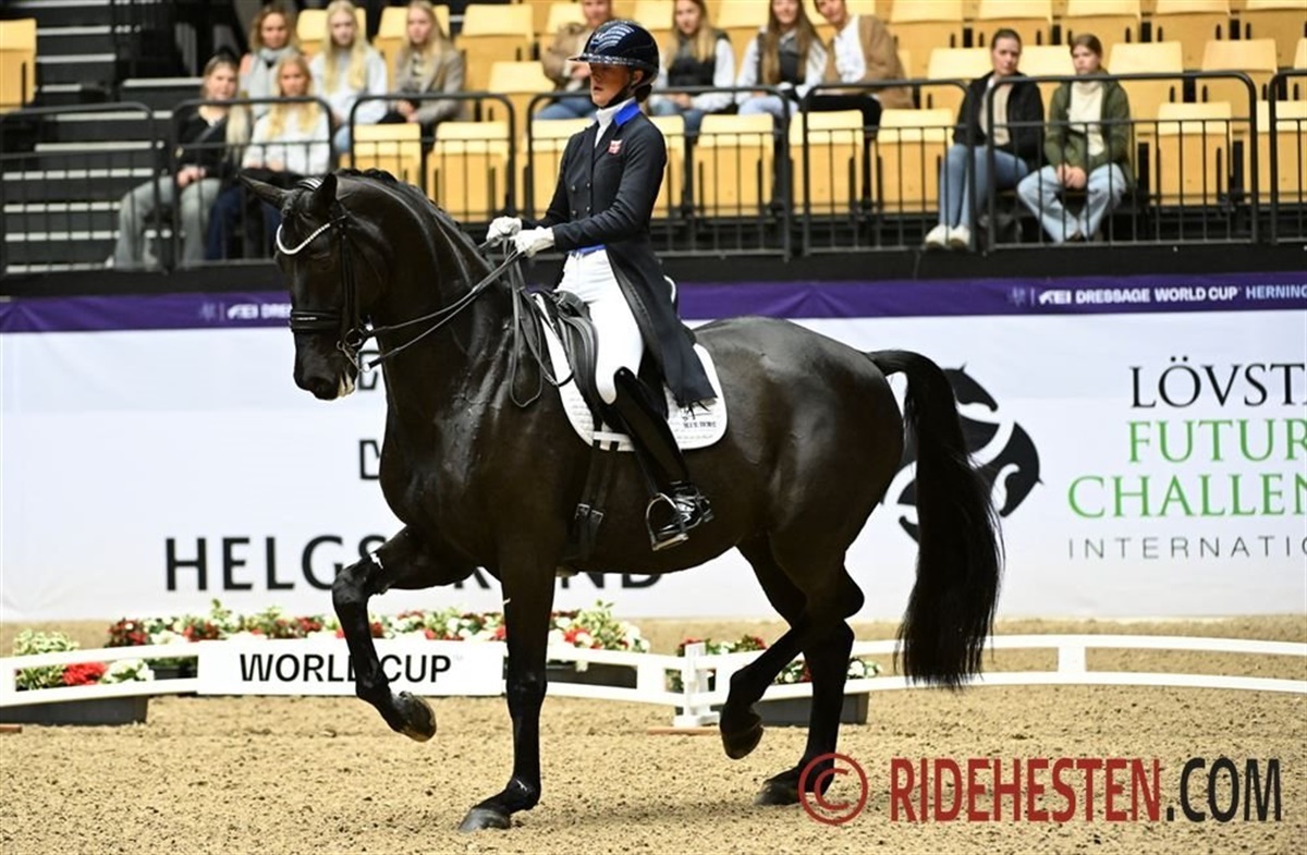 I dagens World Cup-kvalifikationen lykkedes det Blue Hors-rytter Nanna Skodborg Merrald i kraft af sin fjerdeplads at score 13 World Cup-point, hvilket placerer hende som nr. 15 i den vesteuropæiske liga. Med den nu 17-årige avlshingst Blue Hors Don Olymbrio e. Jazz/ Olympic Ferro leverede hun i Grand Prix Kür i dag et ridt til 83,070%, og hun fortæller fra Amsterdam: