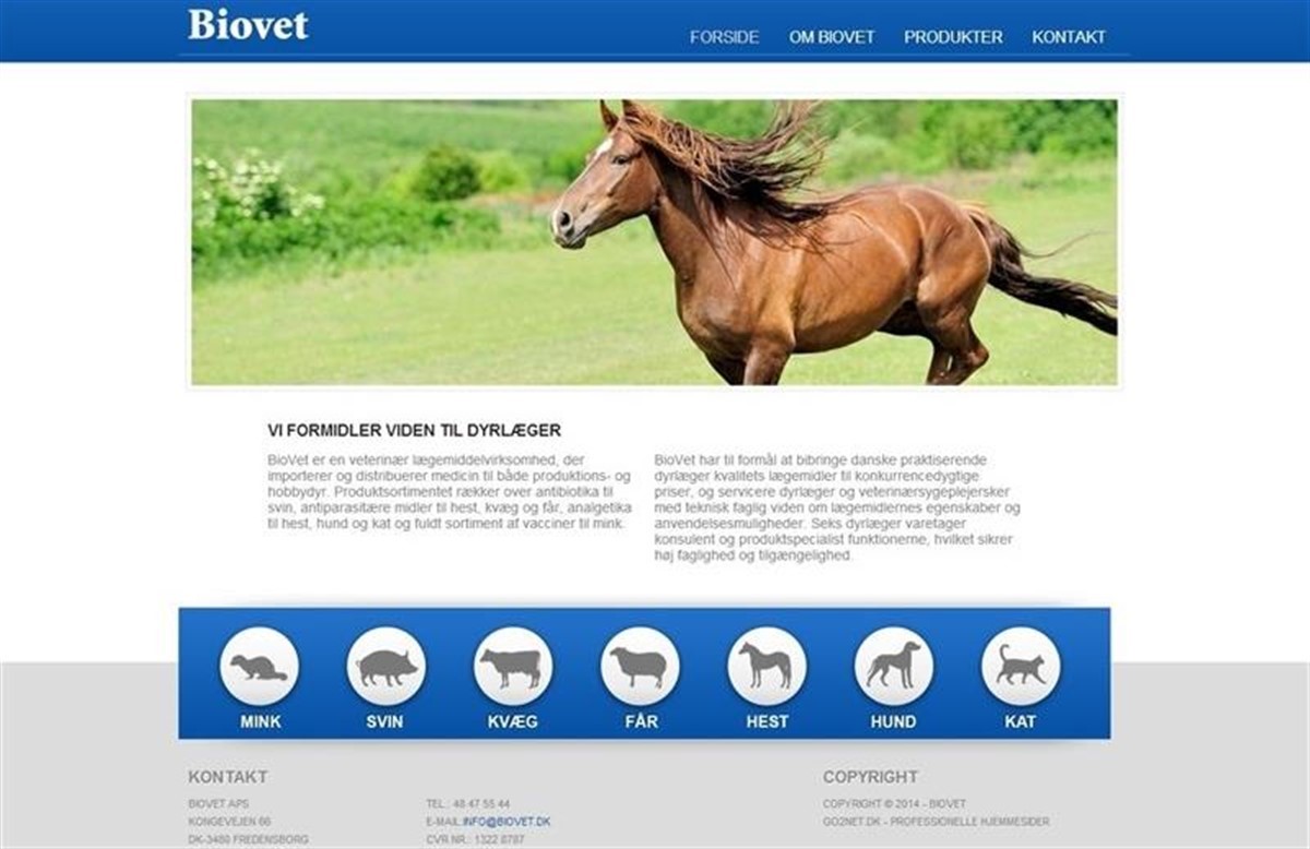 - Vi har valgt en hjemmeside fra Wiegaarden Media go2net, fordi vi er glade for samarbejdet med Wiegaarden og fordi det var en økonomisk ansvarlig løsning. Vi synes godt om muligheden for at man selv kan vedligeholde siden, når man er klar til det eller betale sig fra det hos go2net, fortæller Ann Cecilie Larsen og fortsætter; - Vi synes den er rigtig flot, og enkel. Giver hurtigt et overblik over BioVet’s produkter.