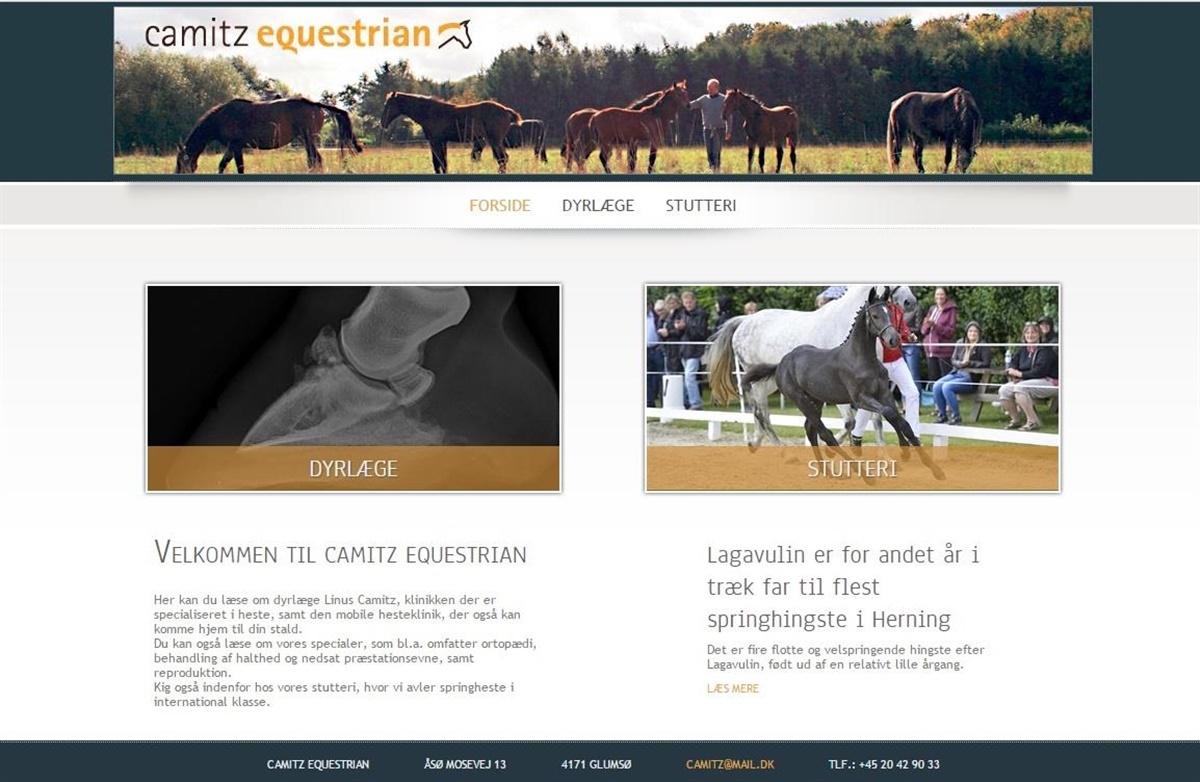 På den nye hjemmeside fra go2net kan du læse om Camitz Equestrians specialer, som bl.a. omfatter ortopædi, behandling af halthed og nedsat præstationsevne samt reproduktion.