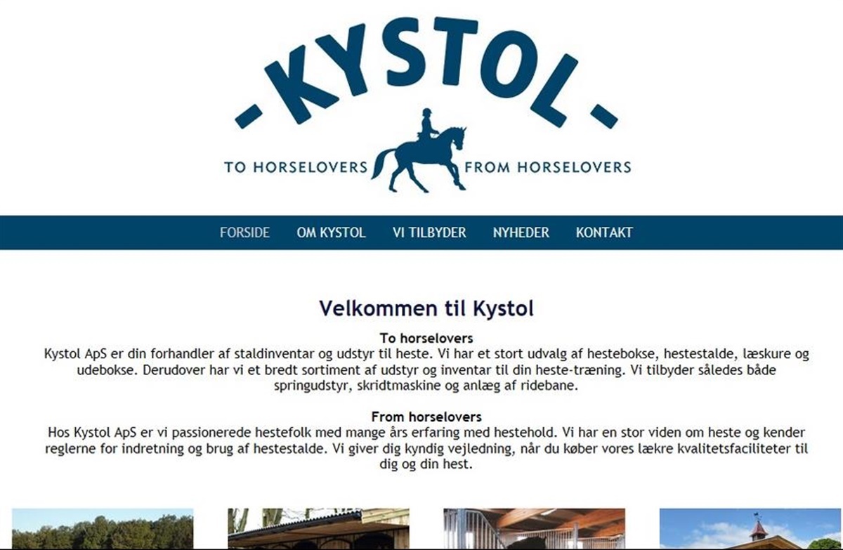 Kystol ApS er din forhandler af staldinventar og udstyr til heste. Kystol har et stort udvalg af hestebokse, hestestalde, læskure og udebokse, ligesom der findes et bredt sortiment af udstyr og inventar til din heste-træning, både i form af springudstyr, skridtmaskine, men også anlæg af ridebane.