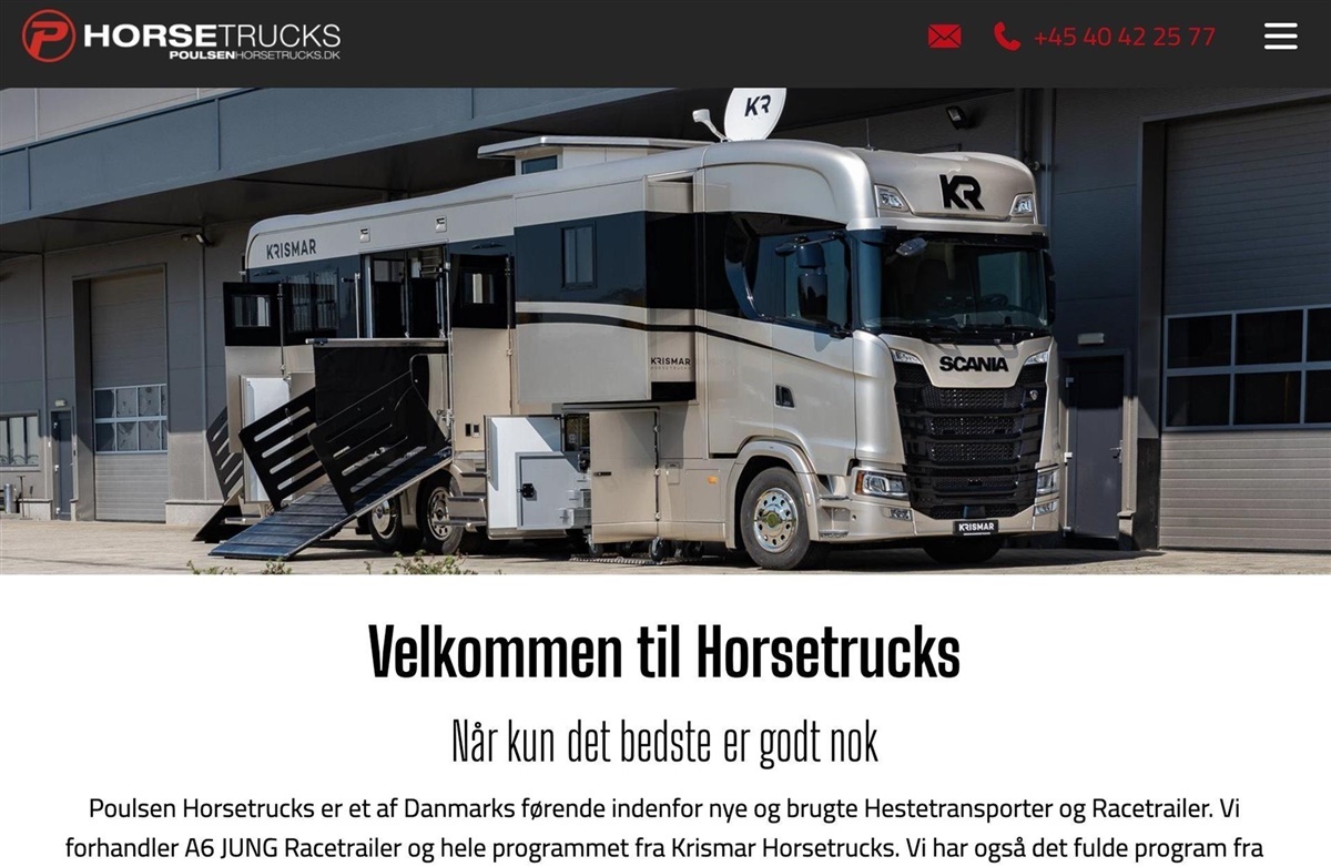 På Poulsen Horsetrucks nye hjemmeside bliver du blandt andet mødt af en af de flotte Krismar-hestetransportere, ligesom du har mulighed for at læse meget mere om virksomheden, samt hvilke muligheder for både køb og leje af hestetransportere, de tilbyder.