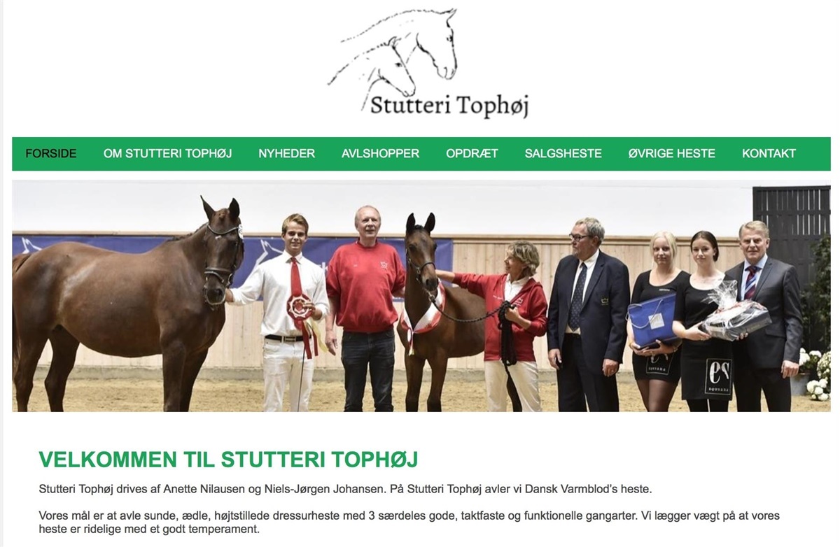 I samarbejde med Go2Net har Stutteri Tophøj så netop fået ny hjemmeside. – Jeg er meget tilfreds med resultatet af den nye hjemmeside, fortæller Anette Nilhausen og tilføjer: - Man har nemt kunnet få svar på alle spørgsmål også uden for almindelig arbejdstid. Til spørgsmålet om hvad Anette føler er det bedste ved denne hjemmesideløsning er hun ikke et øjeblik i tvivl: - Essensen i det er simpelthen, at denne hjemmeside er så nem at betjene, at selv en ikke særligt it-kyndig som mig, kan betjene den uden problemer. Desuden er det nemt at lægge billeder og video på hjemmesiden, og resultatet er af høj kvalitet. Desuden tilføjer Anette at det er et stort plus at kunne få adgang til Ridehestens fotodatabase, da mange af disse billeder er aktuelle for Stutteri Tophøj at bruge på nettet.